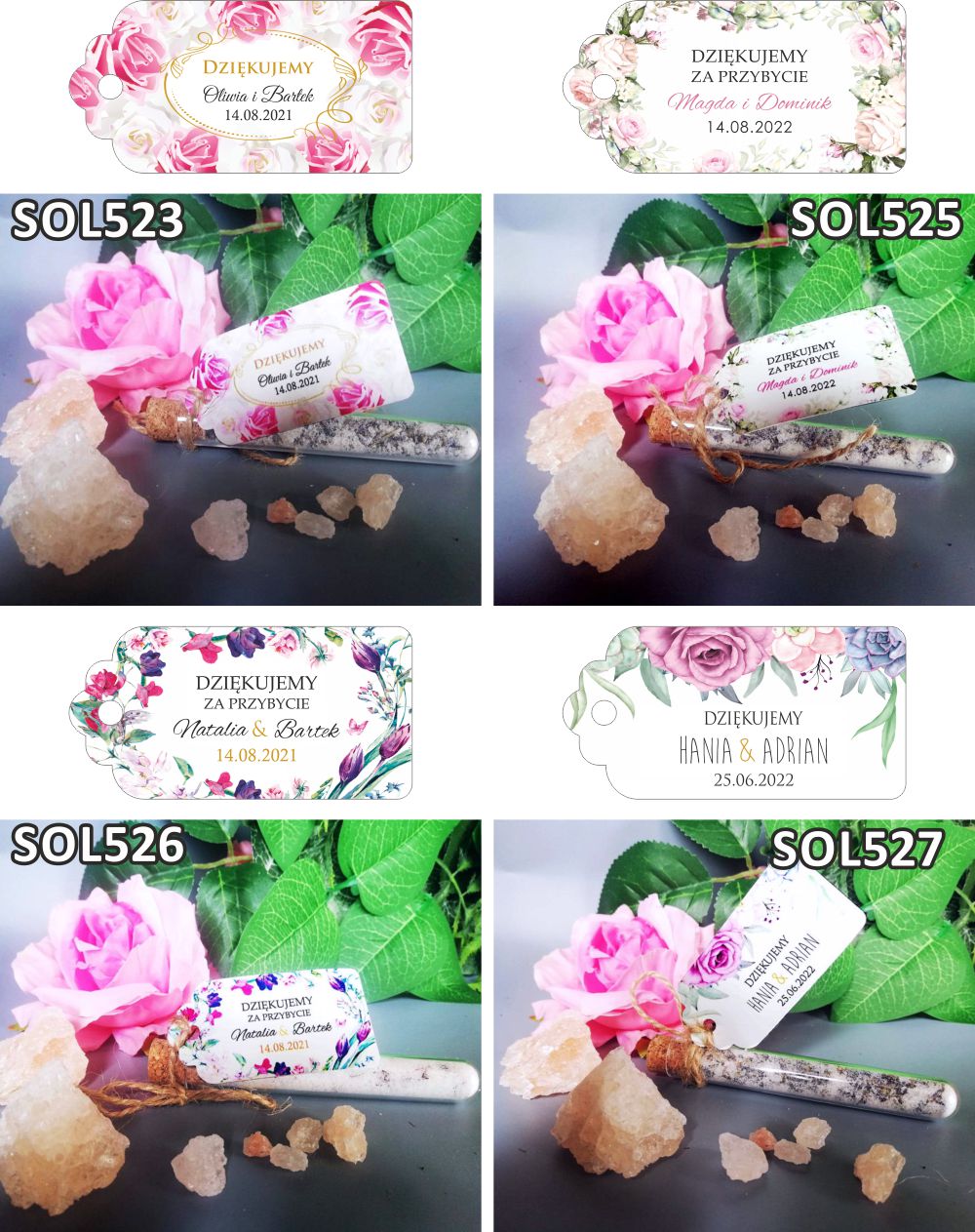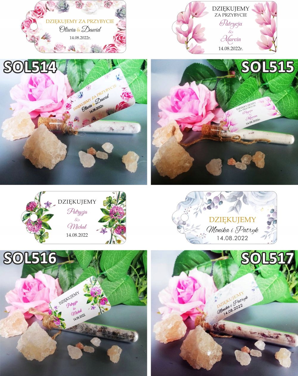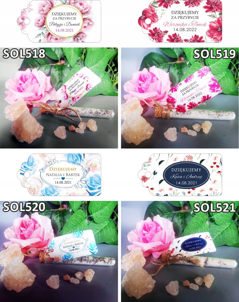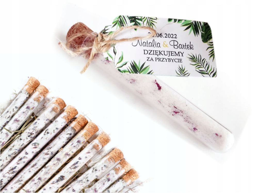 Весільні флакони з сіллю для ванн - це естетичний подарунок для гостей та оригінальна подяка за прихід. Такий подарунок принесе гостям масу радості та відпочинку. Солі підходять для розслаблюючої ванни, заспокоюють і позитивно впливають на стан і стан шкіри.