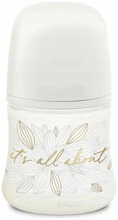 Золота пляшечка 150 мл із фізіологічною соскою SX Pro з повільним потоком, розроблена з урахуванням розвитку ротової порожнини дитини. Призначена для немовлят +0 м, пустушка дозволяє утримувати язик у такому ж природному положенні, як і при годуванні з грудей матері. Пустушка схвалена Іспанським товариством дитячої стоматології.