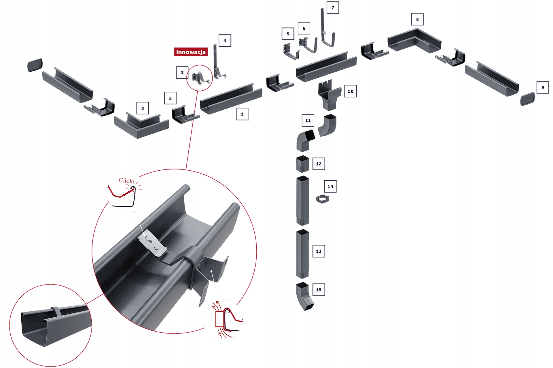 - Ефект однорідної, ідеально гладкої поверхні, без використання кришки, додатково підсилюється подвійним вульвом, спрямованим всередину жолоба. Завдяки цьому рішенню жолоб є не тільки винятково естетичним, але й дуже жорстким, що, у свою чергу, означає стійкість до деформації та гарантує, що жолоб не буде хвилятися та завжди зберігає бездоганну лінію.