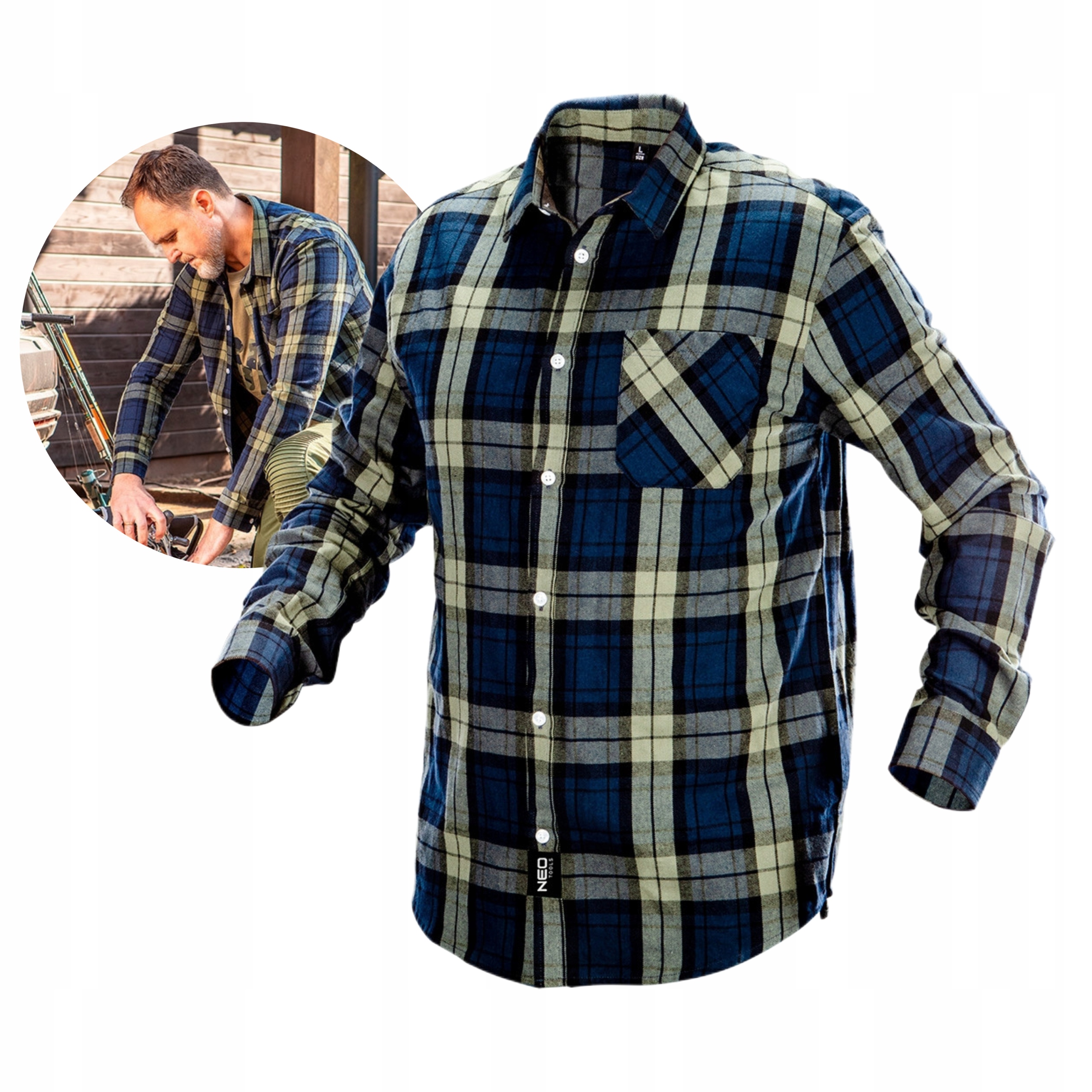 Робоча фланелева сорочка NEO (арт. 81-541) виготовлена з чесаної бавовняної пряжі (100% бавовна). Завдяки спеціальному процесу чищення вона м'яка на дотик. Подвійна кокетка на спині, що розширюється до плечей, зміцнює місця, схильні до стирання. Виготовлена з тканини, що не мнуться, завжди виглядає добре. Діагонально вирізана нагрудна кишеня більш стійка до навантажень. Подвійна складка спереду забезпечує стабільність петель і полегшує застібання ґудзиків. Профільована обробка низу надає міського крою. Посилений комір і манжети не деформуються під час використання