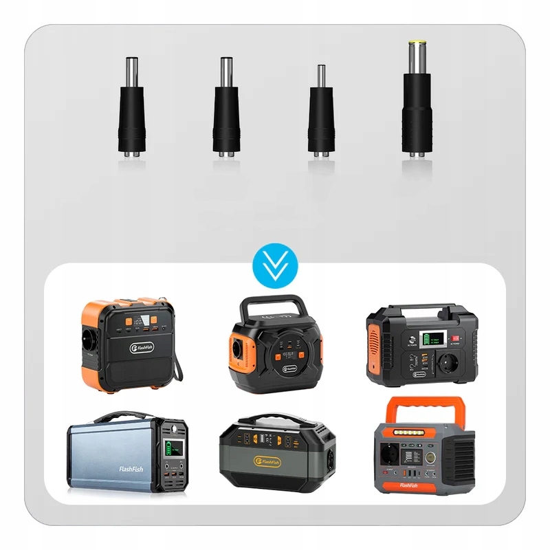 та 3 додаткові роз'єми (адаптер постійного струму 8 мм до нульового/Джекері, постійного струму 5,5 x 2,5 мм для портативного генератора Suaoka та 3,5 х 1,35 мм роз'єму).