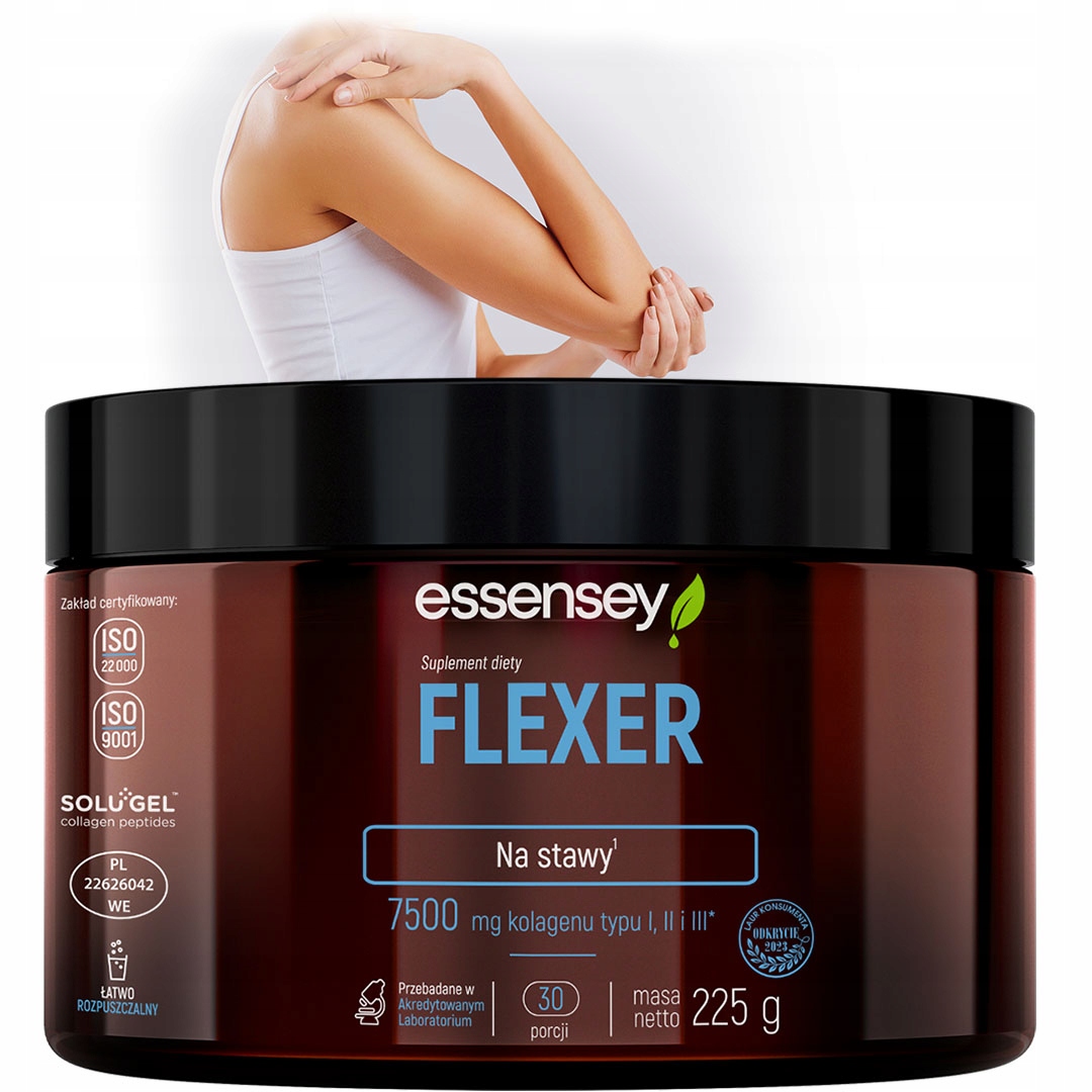 Колаген — це структурний позаклітинний білок, який становить майже 1/3 від загальної кількості білка в організмі людини. Існує 28 типів колагену, найпоширенішим з яких є колаген типу I. Він природним чином міститься в шкірі, кістках, сухожиллях і зв’язках. [4] Колаген типу II міститься в суглобовому хрящі і разом з протеогліканами становить основні компоненти хрящової матриці. [5] Дієтична добавка ESSENSEY FLEXER містить колаген типів I, II і III.