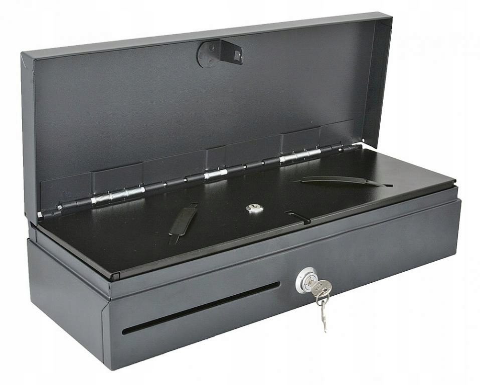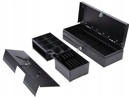 Відкидна шухляда відкривається вгору, розташована на краю касової станції. Відкривається ключем або електромагнітом касовим апаратом, фіскальним принтером або комп'ютером. Двопозиційний замок з ключем. Місткість: 6 відділень для банкнот і 8 відділень для монет, отвір для чеків і ваучерів. Змінний вкладиш закритий металевою кришкою з замком на ключ. Колір чорний