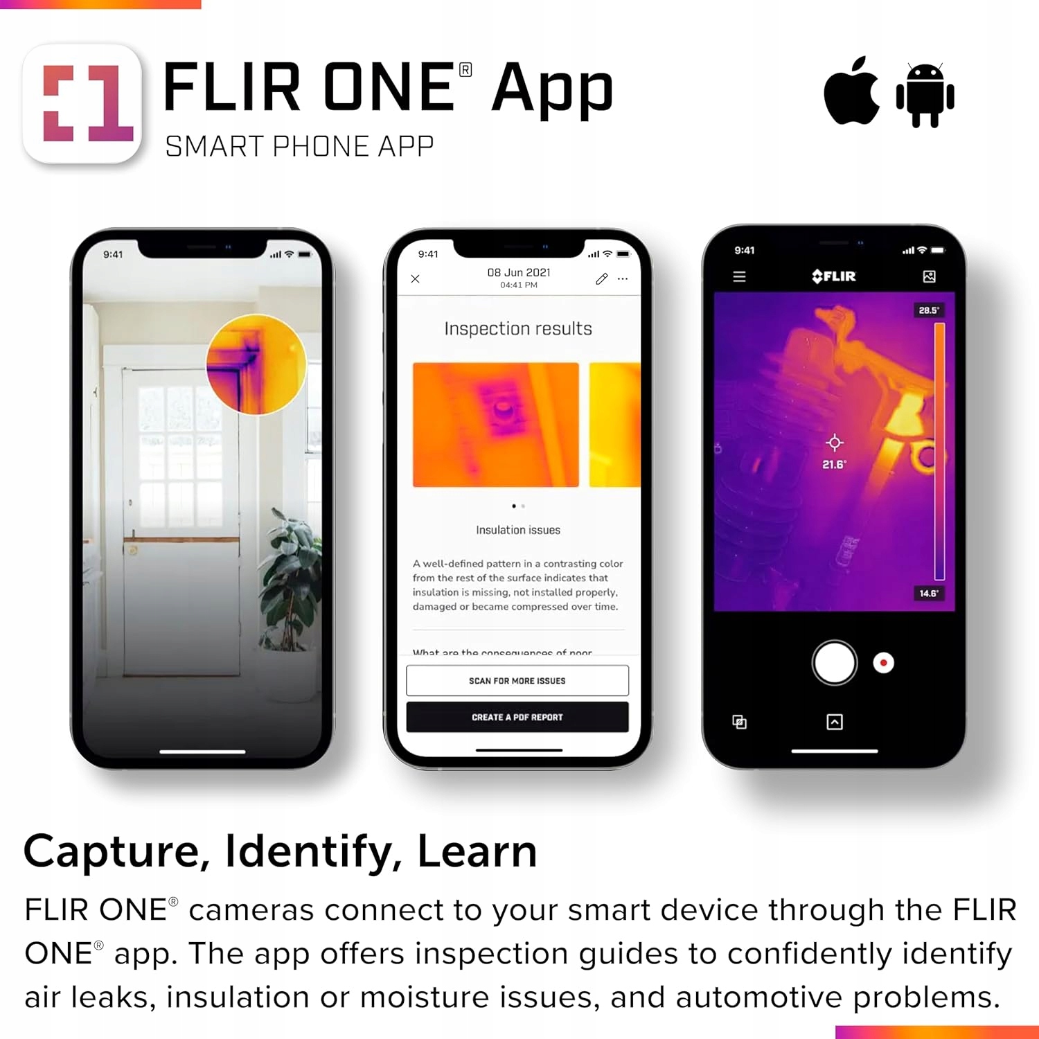 Flir One Pro допоможе вам швидше, ніж будь -коли, важко виявити проблеми. Поєднуючи термоелектричний датчик високої роздільної здатності, здатний вимірювати температуру до 400 ° C (до 752 ° F) з потужними інструментами вимірювання та здатністю генерувати звіти, Flir One Pro працюватиме так само важко, як і ви. Вдосконалений додаток дозволяє надсилати теплові зображення на смарт -годинник, дозволяє розблокувати функції "Pro", які допомагають отримати найкраще зображення, містить фільми з порадами та хитрощами та сумісні з інструментом Flir Tool, що полегшує Повідомте безпосередньо з телефону. Vividir ™, Flir One Pro дозволяє більш детальне вимірювання, також дозволяє отримати доступ до невеликих елементів з більшої відстані, завдяки якому робота на електричних пристроях є більш безпечною. Flir One, завдяки використаній технології MSX®, поєднує зображення з обох камер для створення теплових зображень із посиленою деталізацією та роздільною здатністю. Суспільство може бути регульоване в межах від 0,3 м до нескінченності. Flir One Pro дозволяє вимірювати температуру в діапазоні від -20 ° C до 400 ° C (-4 ° F до 752 ° F). Завдяки трьох метрів температури на місці вимірювання та можливості читання шести областей, Flir One Pro надає додаткову можливість аналізу та звітування зображення під час подорожі. Пристрій стійкий до падіння з висоти до 1,8 м.