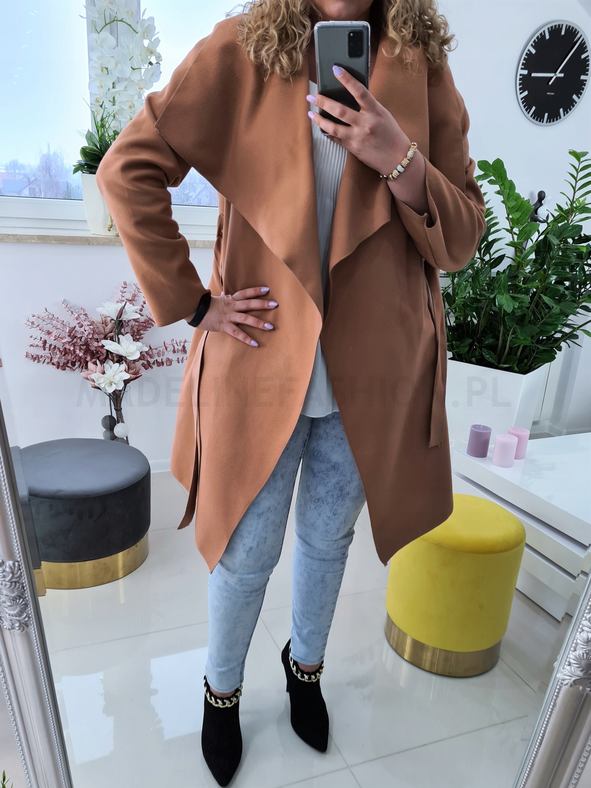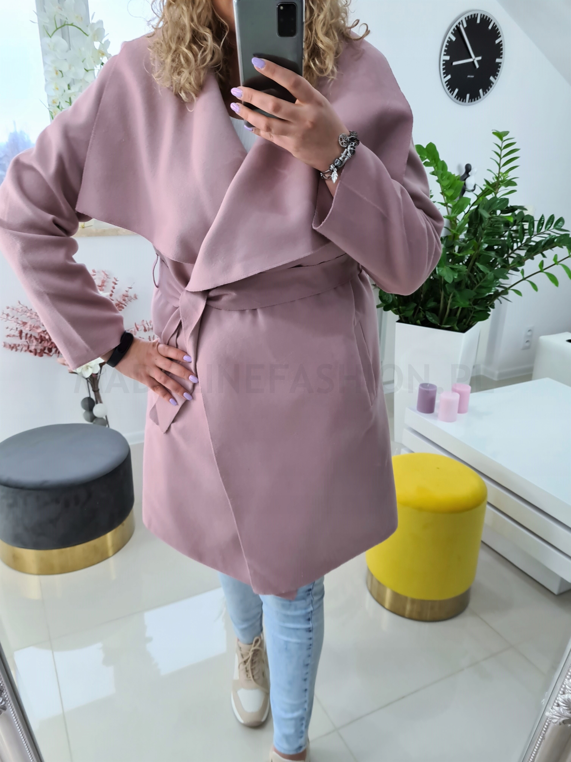 Легке жіноче пальто, яке також можна використовувати як накидку. Дуже приємна на дотик, виготовлена з ніжного матеріалу. Універсальний крій, підходить для будь-якої фігури та стилю. Талія підкреслена поясом, відкладний комір можна оформити декількома способами.