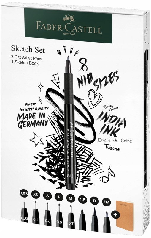 Набір Faber-Castell Pitt Artist Pen 8 шт. з наконечниками XXS 0,05 мм, XS 0,1 мм, S 0,3 мм, F 0,5 мм, M 0,7 мм, наконечник пензля B, 1,5, FM (Fude Medium) у кольорі 199. (чорний) + скетчбук. Він поєднує в собі переваги традиційних малюнків і ескізів тушшю з сучасним, простим у використанні інструментом. Туш надає малюнкам виразність і довговічність, при цьому дозволяє поєднувати їх з багатьма іншими техніками. Ідеально підходить для ескізів, малювання, модного дизайну та ілюстрації. З довгим металевим наконечником для письма. Містять пігментовану туш з нейтральним PH, без кислот. Вони не мають запаху і світлостійкі. Після висихання вони водостійкі, не розмазуються по паперу і не просвічуються на іншу сторону. Примітка - через пігментне чорнило ручки слід зберігати в горизонтальному положенні.
