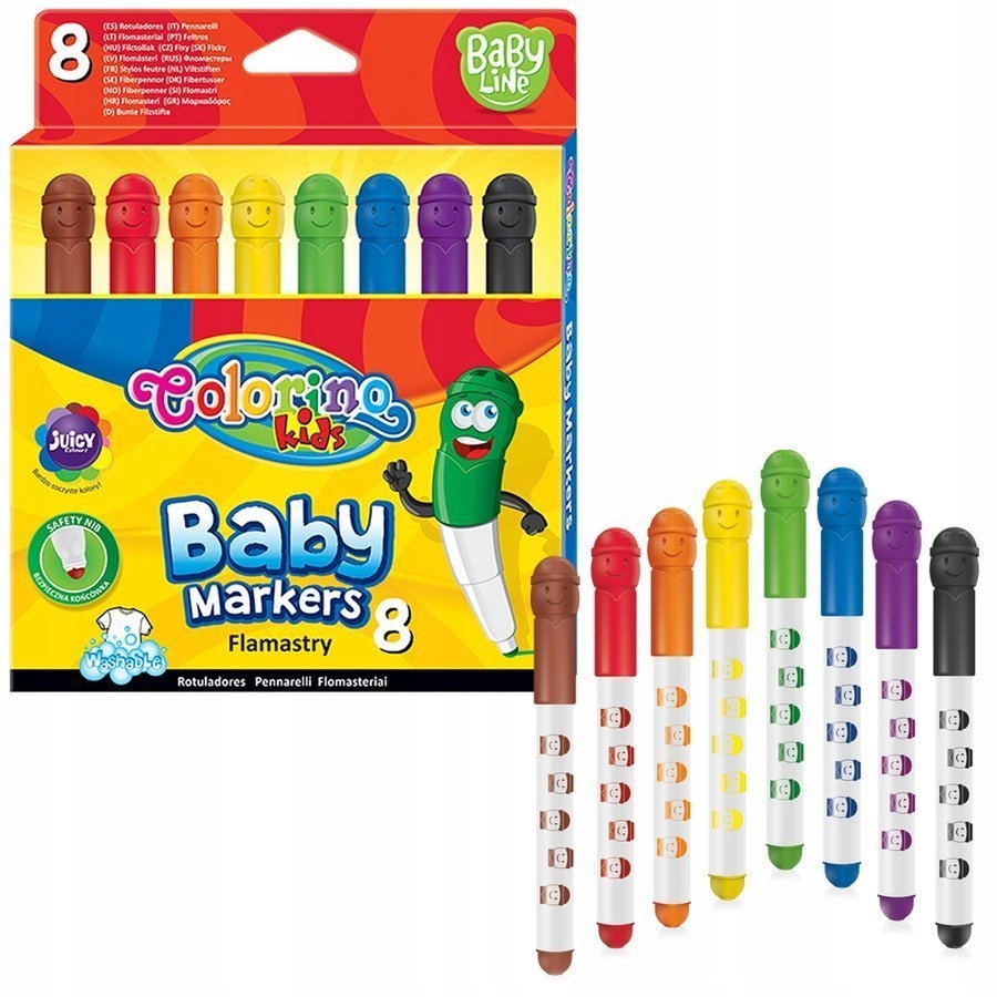 Маркери 8 кольорів, ідеальні для наймолодших художників. Вони мають вентильований ковпачок і круглий захисний наконечник. Вони нетоксичні і змиваються водою.