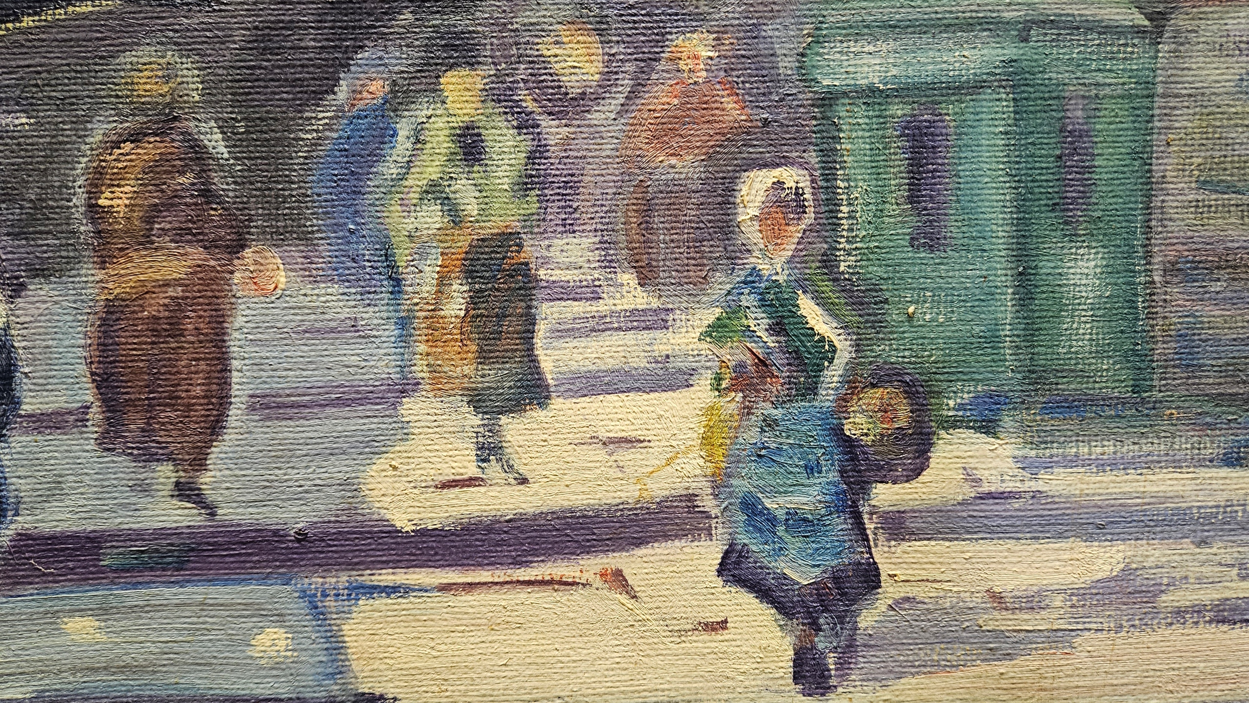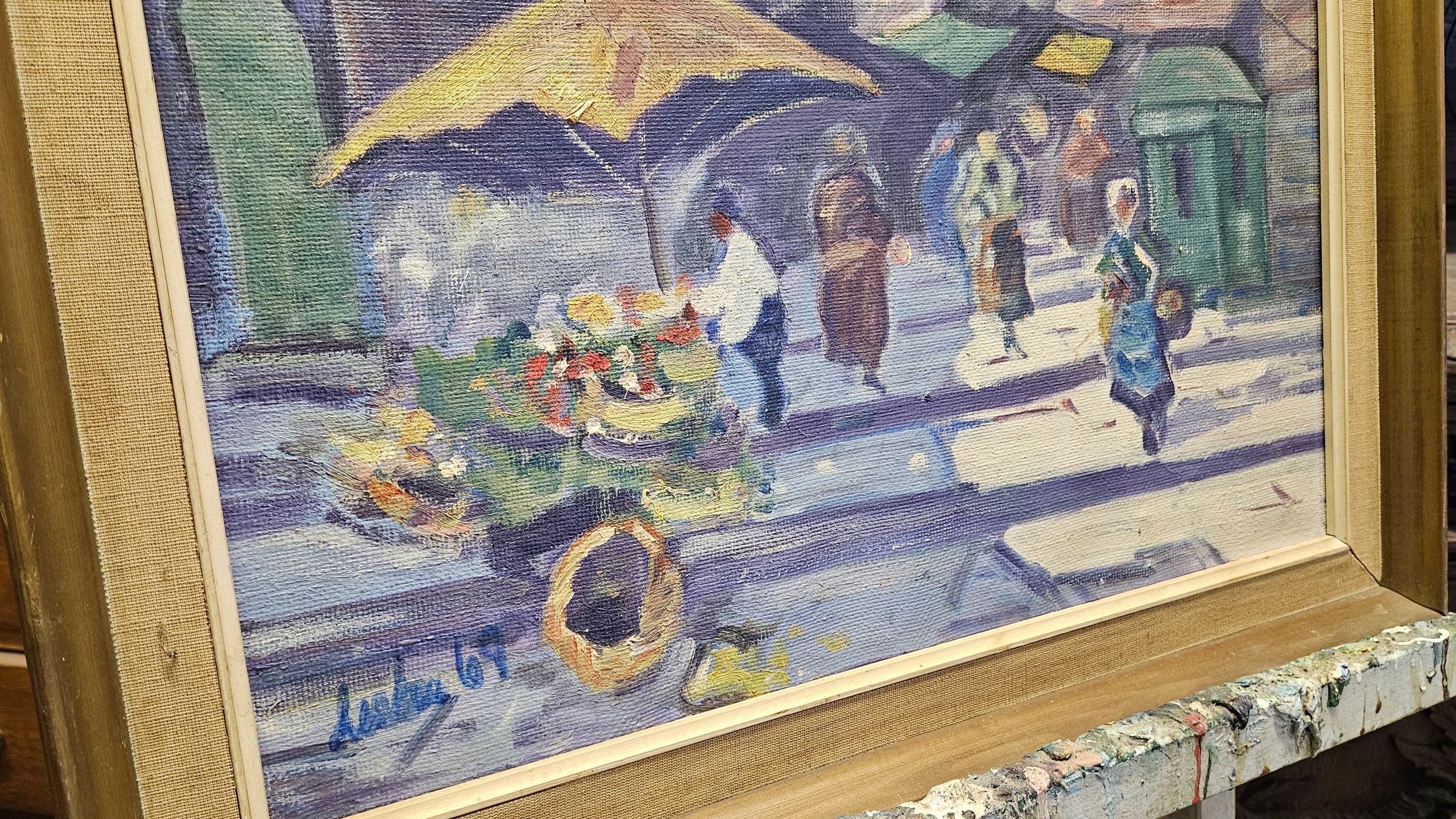 Опис: Прекрасна стара картина, що зображує ранковий пейзаж міста з квітовою стійкою. На задньому плані видно будівлі та мешканці, які проходять вулиці. Можливо, що це Копенгаген або Париж. Зображення, намальоване масляними фарбами на полотні, у суцільній золотих рамках.