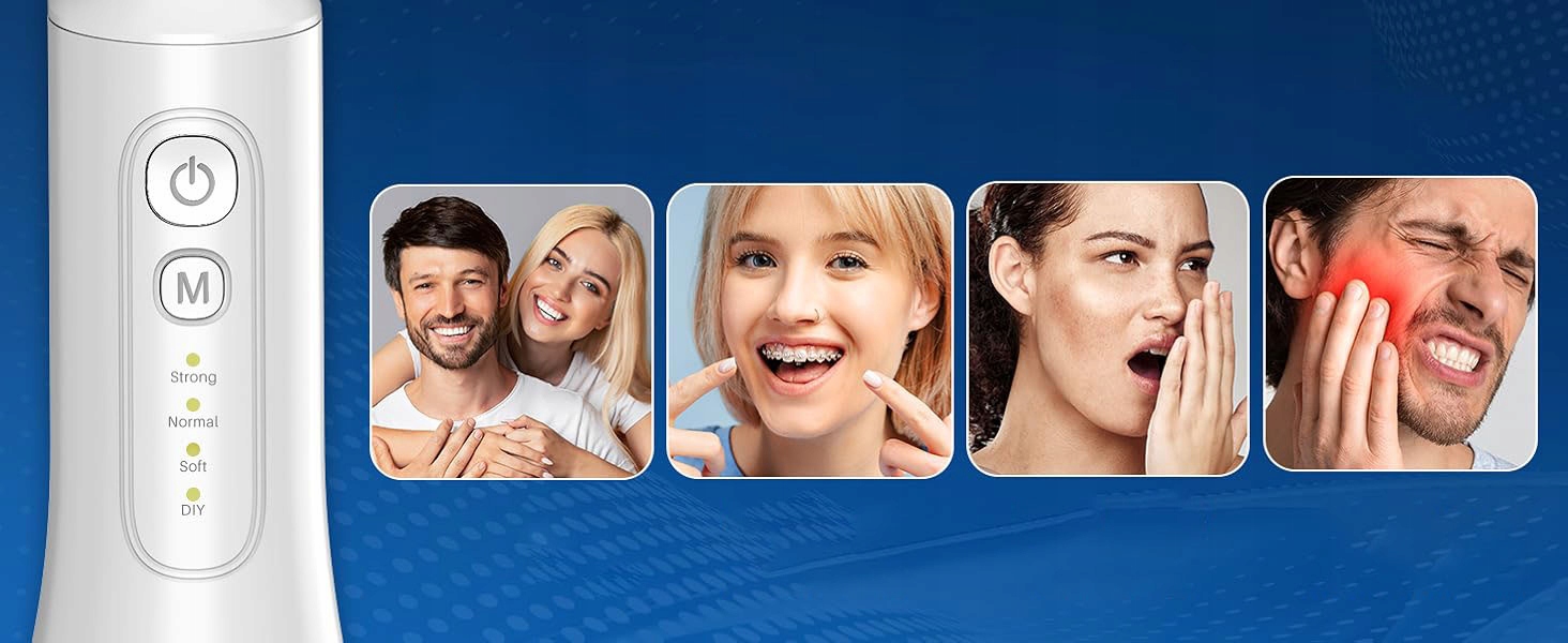Портативний зубний іригатор має частоту 1600–1800 пульсацій на хвилину та регульований тиск води в діапазоні від 20–140 PSI для ефективного видалення нальоту та сміття. Містить 4 спеціальні наконечники, призначені для чищення важкодоступних місць, напр. простір під ортодонтичними апаратами, простір між зубами та лінією ясен. Підходить для щоденного догляду за порожниною рота, подорожей і домашнього використання.