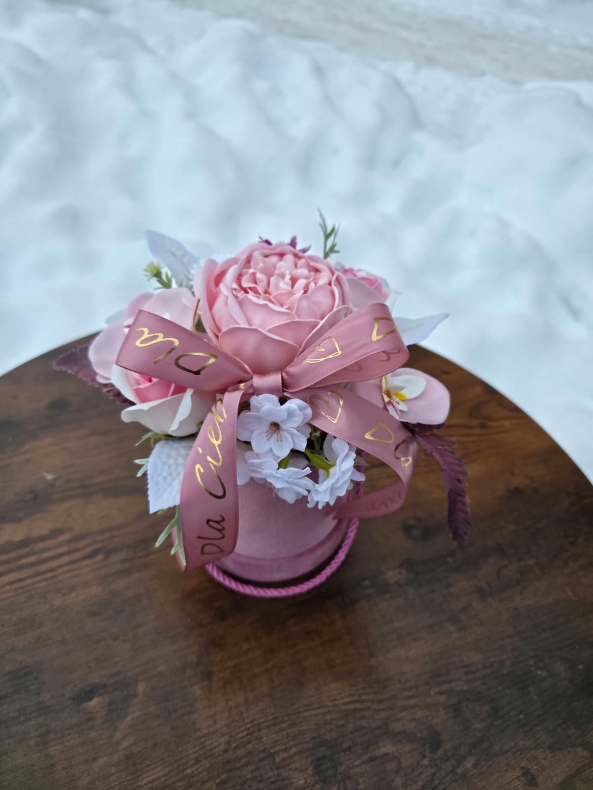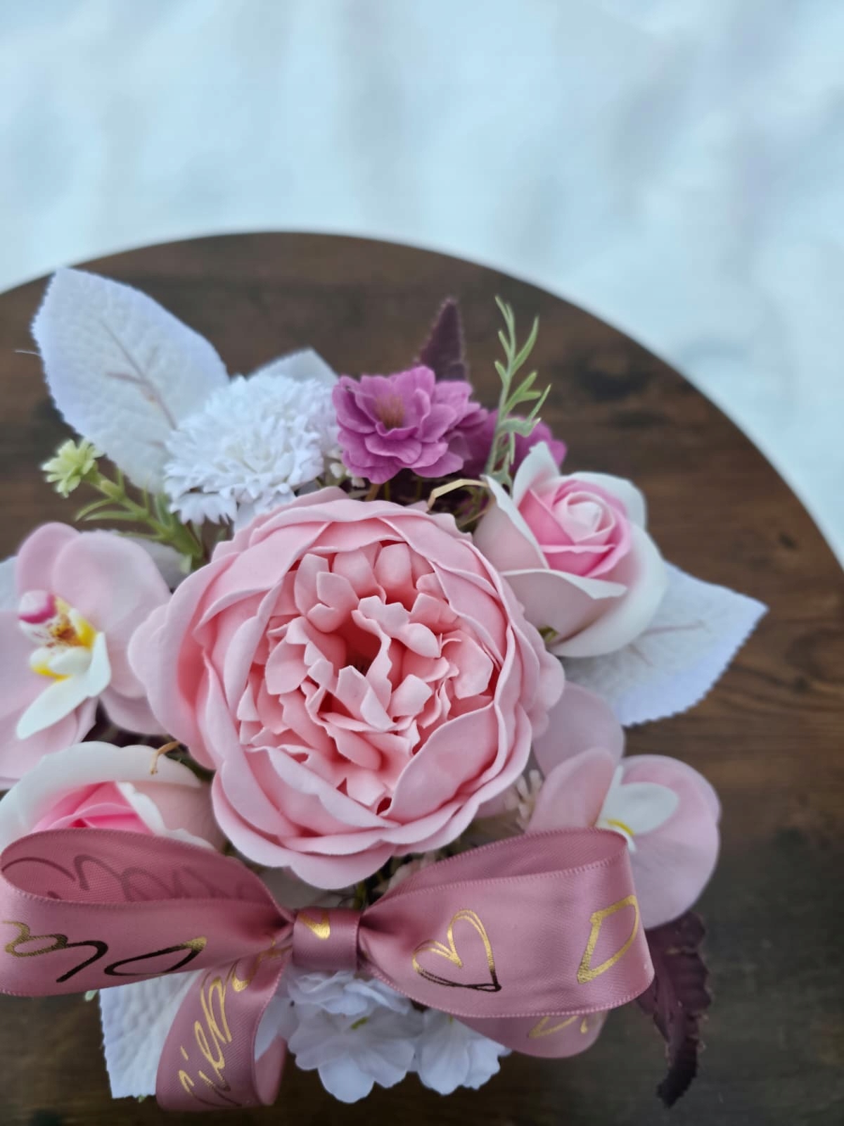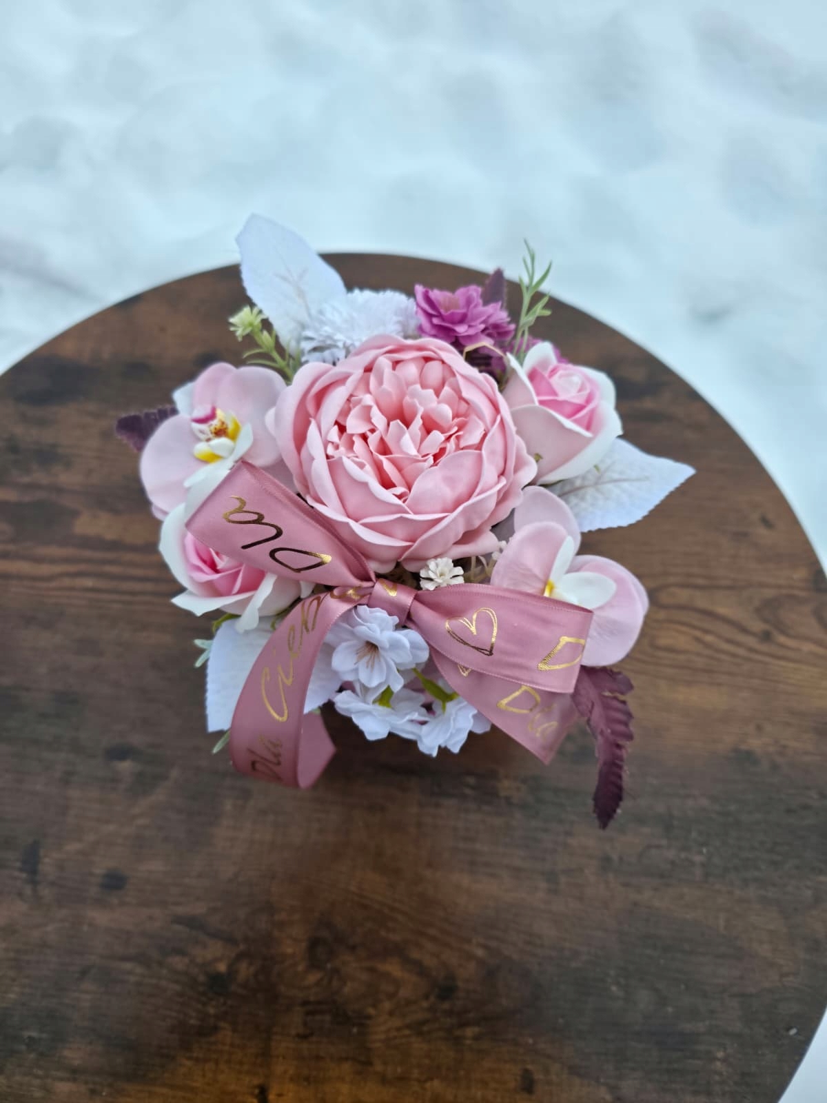 Комппозиція виготовлена з високоякісних мильних квітів та штучних добавок, що гарантує довговічність та естетичний вигляд.