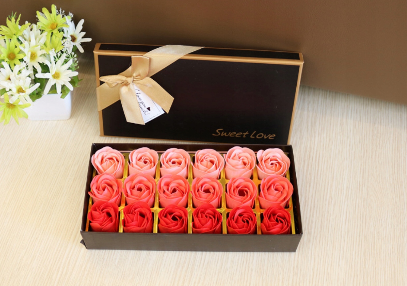 Ця декоративна коробка містить гарно виготовлені квіти з мила, які виглядають як справжні.