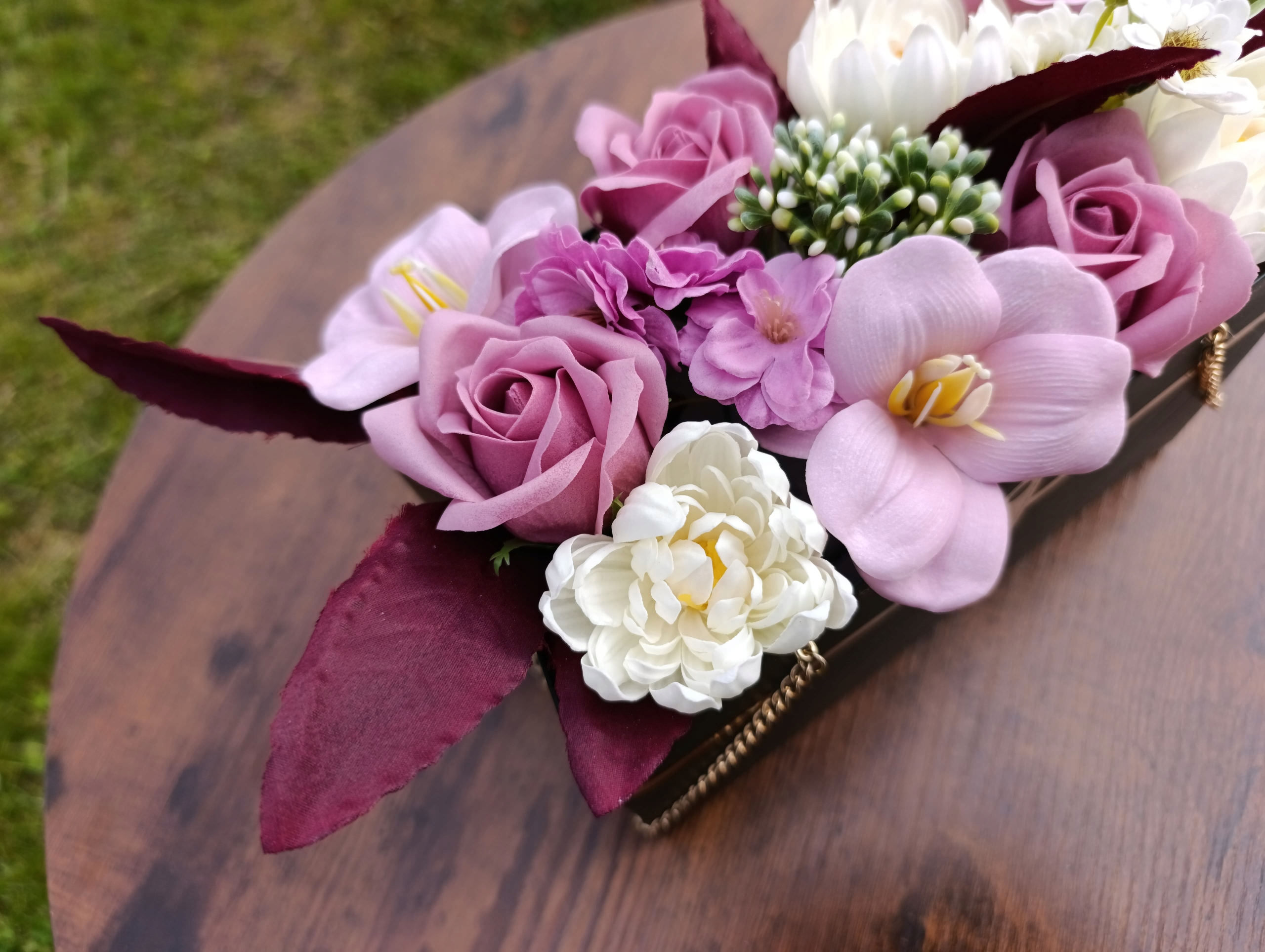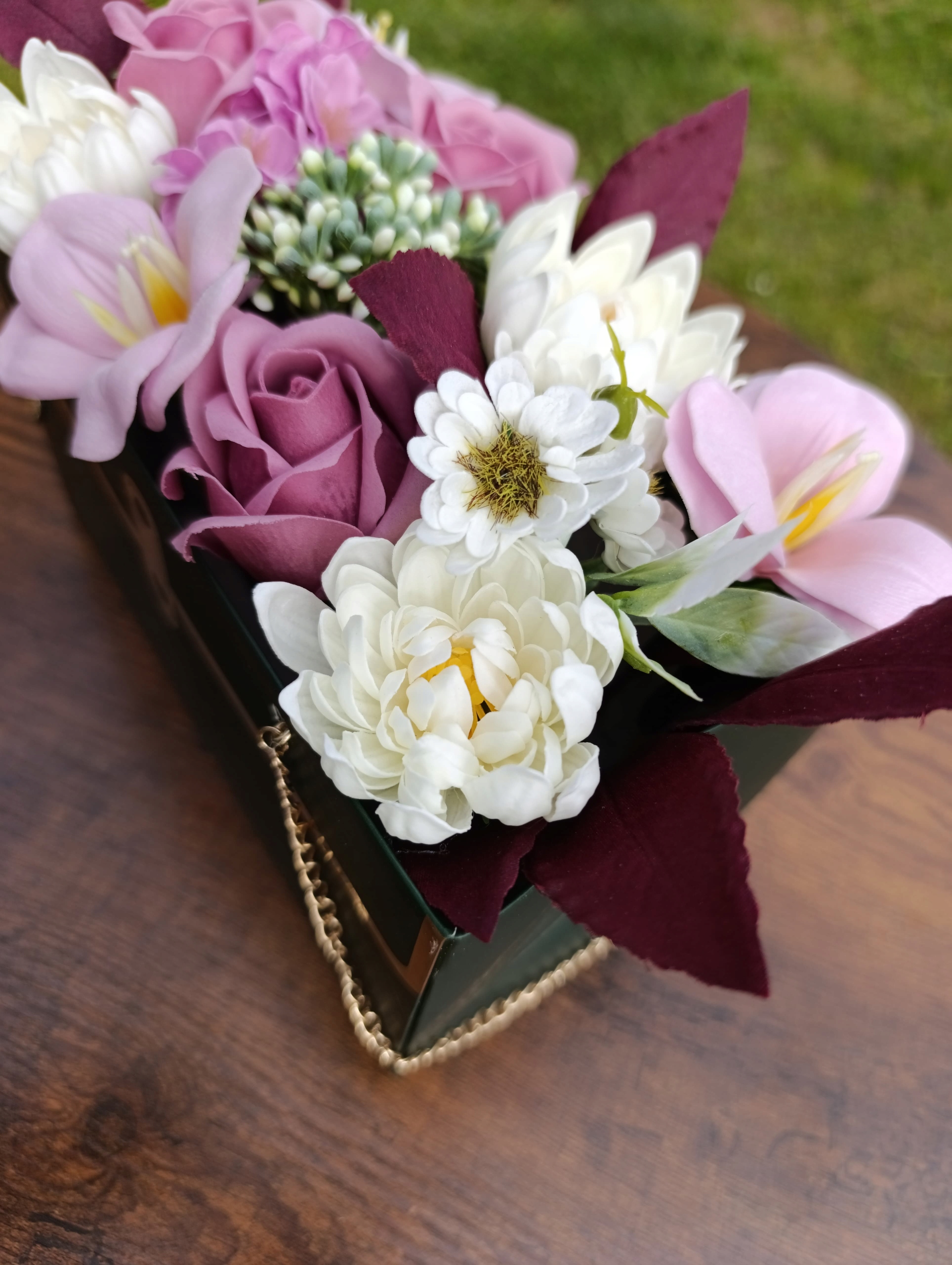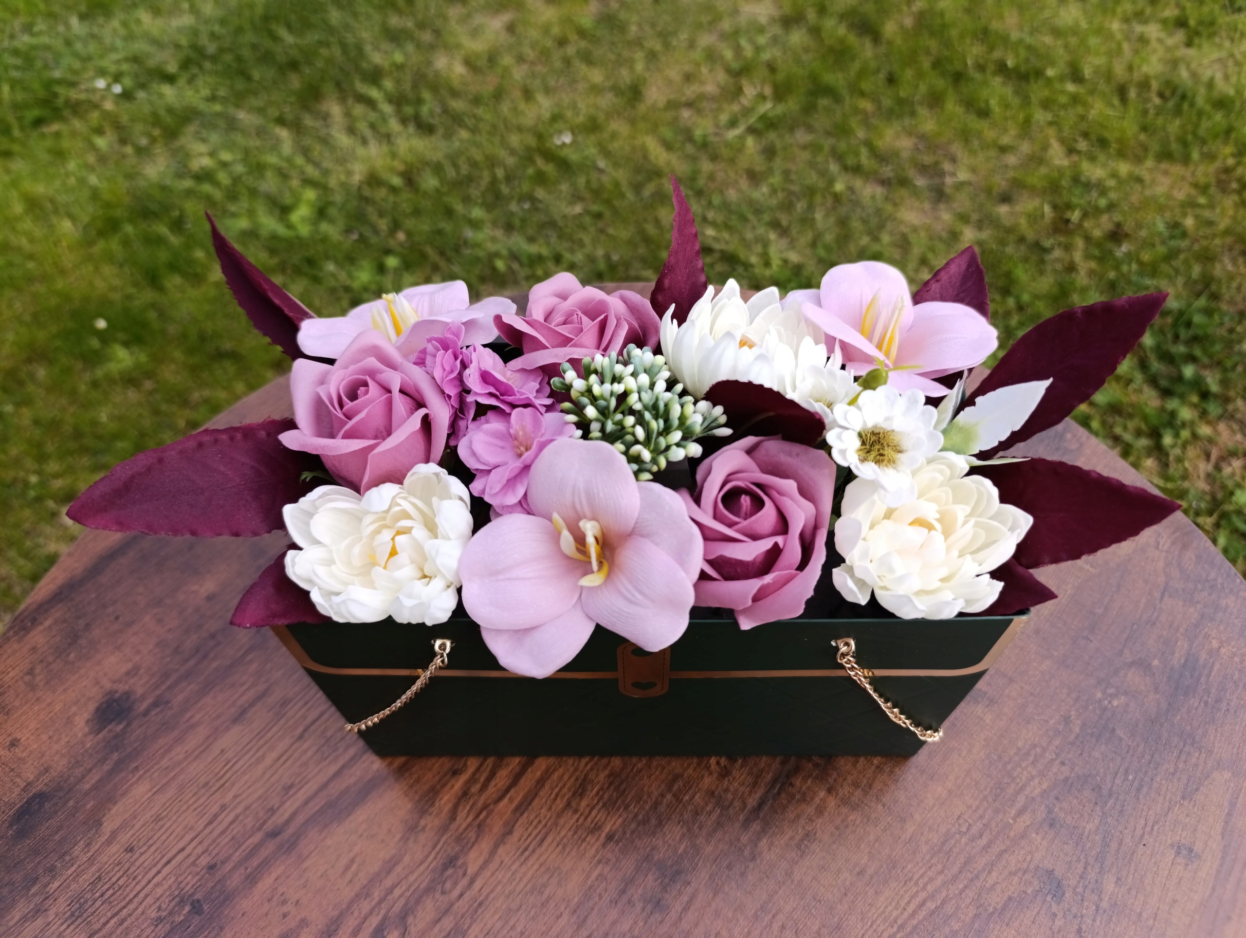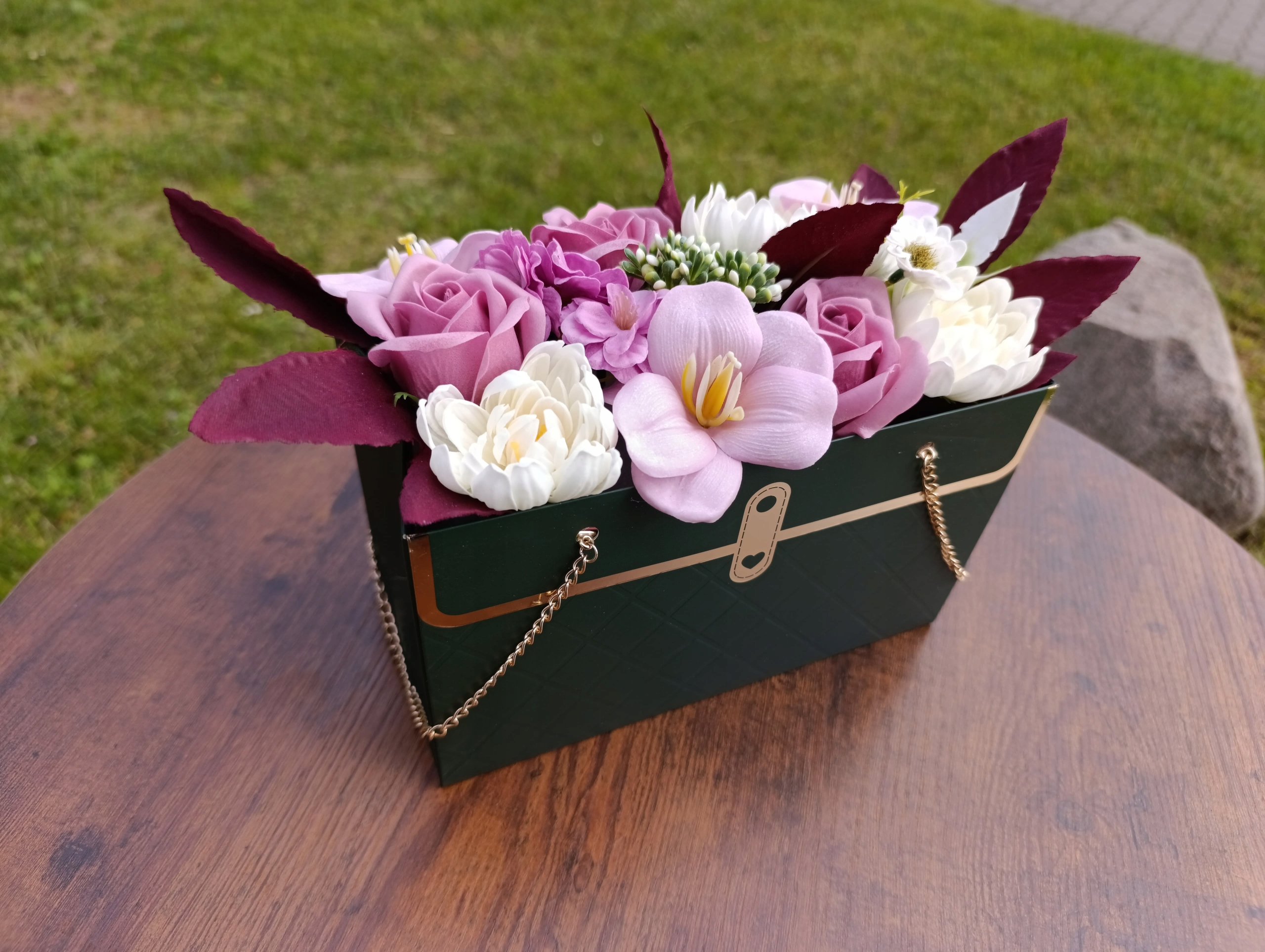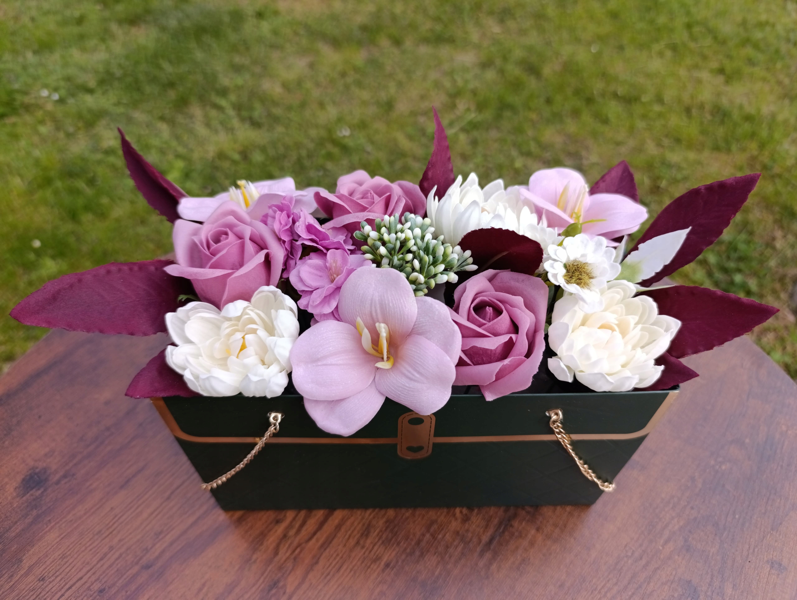 ✔ композиція складається з, серед інших, мильних квітів: троянди або далії та численних додаткових добавок у вигляді, серед інших: штучні листя та багато інших. Квітковий ящик був зроблений вручну з увагою до кожної деталі, завдяки якій вона гарантує прекрасний вигляд довго.