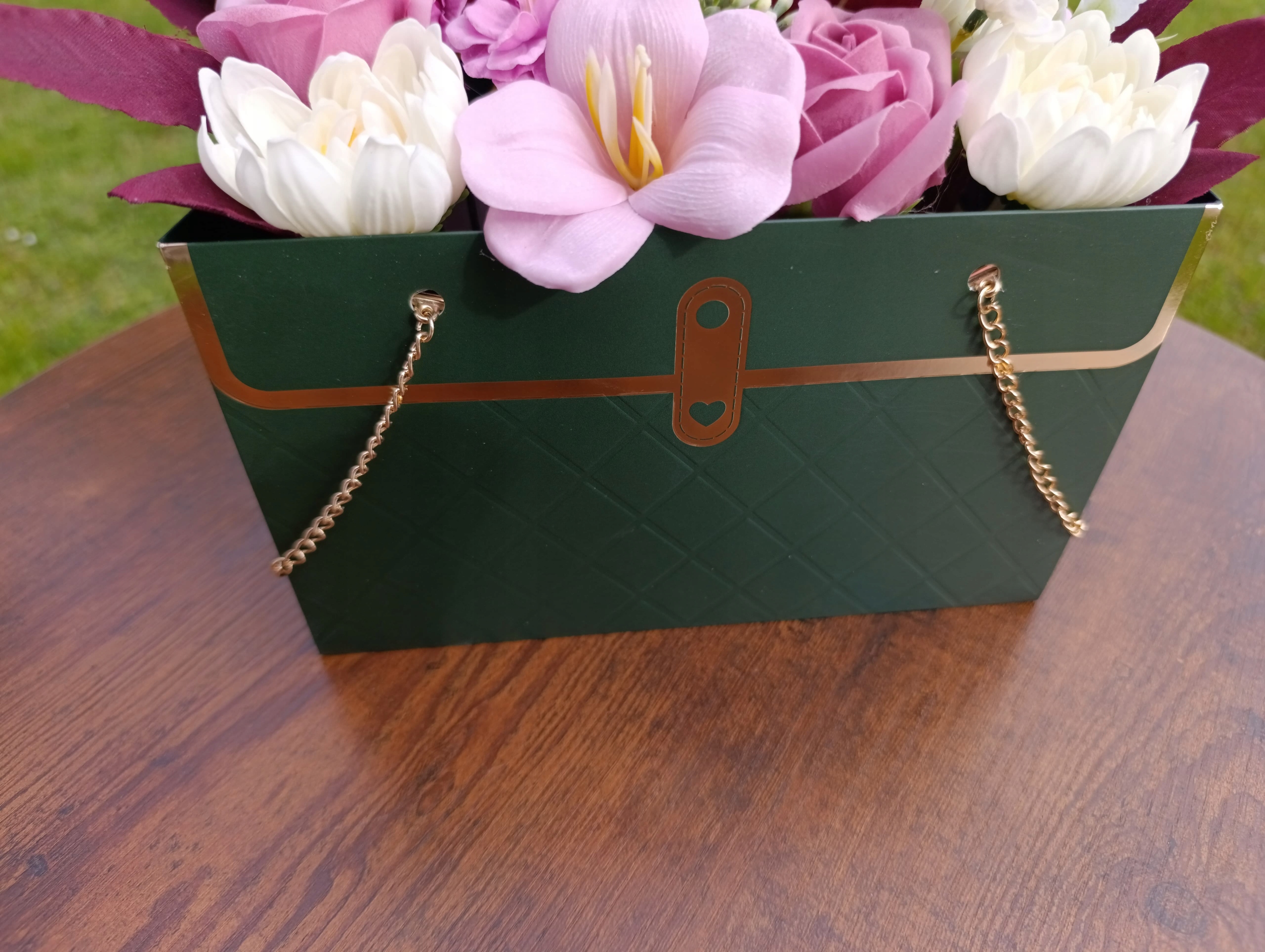 мішок із зеленою гламурною коробкою з квітами з мильними квітами та золотим ланцюгом