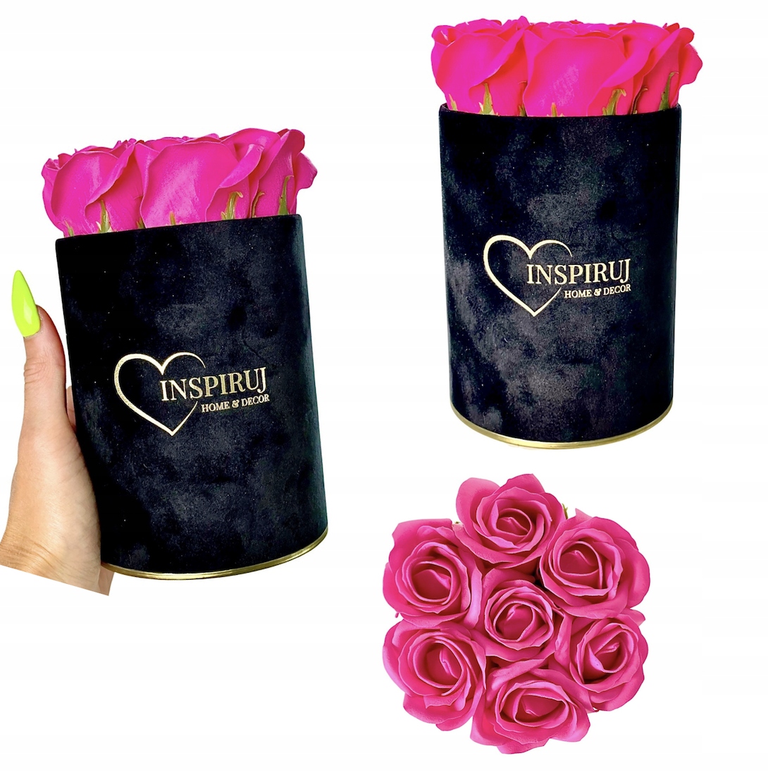 Коробка виготовлена в Польщі. Виготовлений з високоякісного оксамиту, з золотим дном і золотим написом Inspire методом гарячого тиснення. Ми виготовляємо ящики для квітів з мильними трояндами вручну, тому розташування квітів і висота закладення може дещо відрізнятися від розмірів, наведених нижче в специфікації товару.