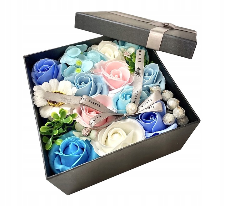 Коробка для квітів виготовлена з мильних квітів у чорній квадратній коробці з кришкою, перев'язаною стрічкою. Квіти виготовлені з мильної стружки, наклеєні на пінополістирольну основу та вмонтовані у флористичну основу. Коробка прикрашена перлами, блискучими кульками, зеленими пластиковими гілками та стрічкою.