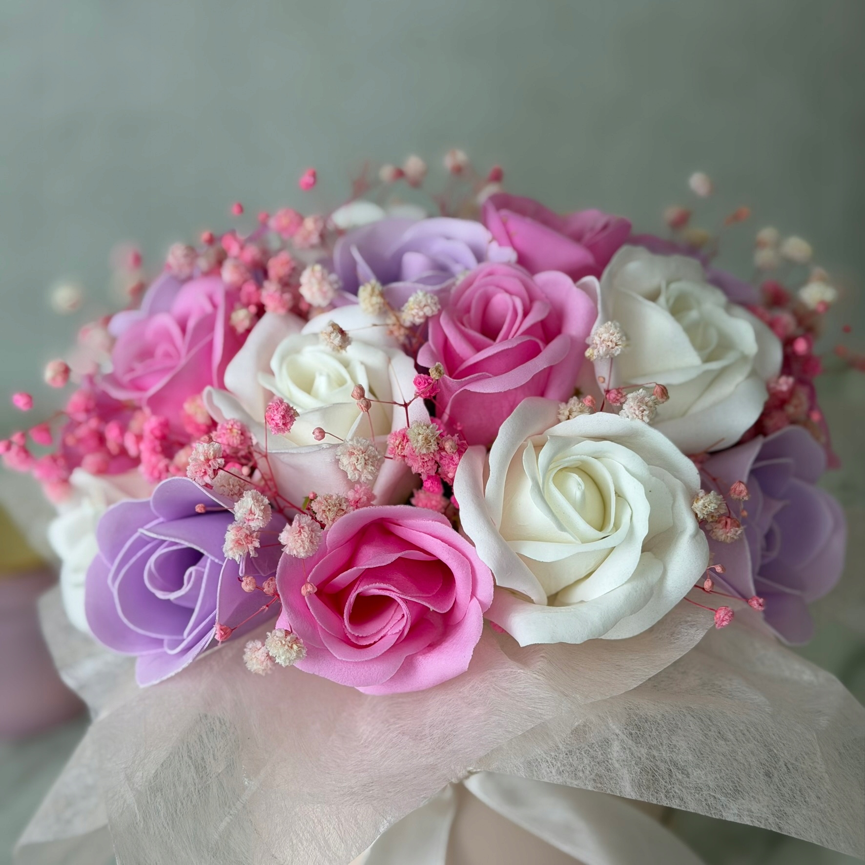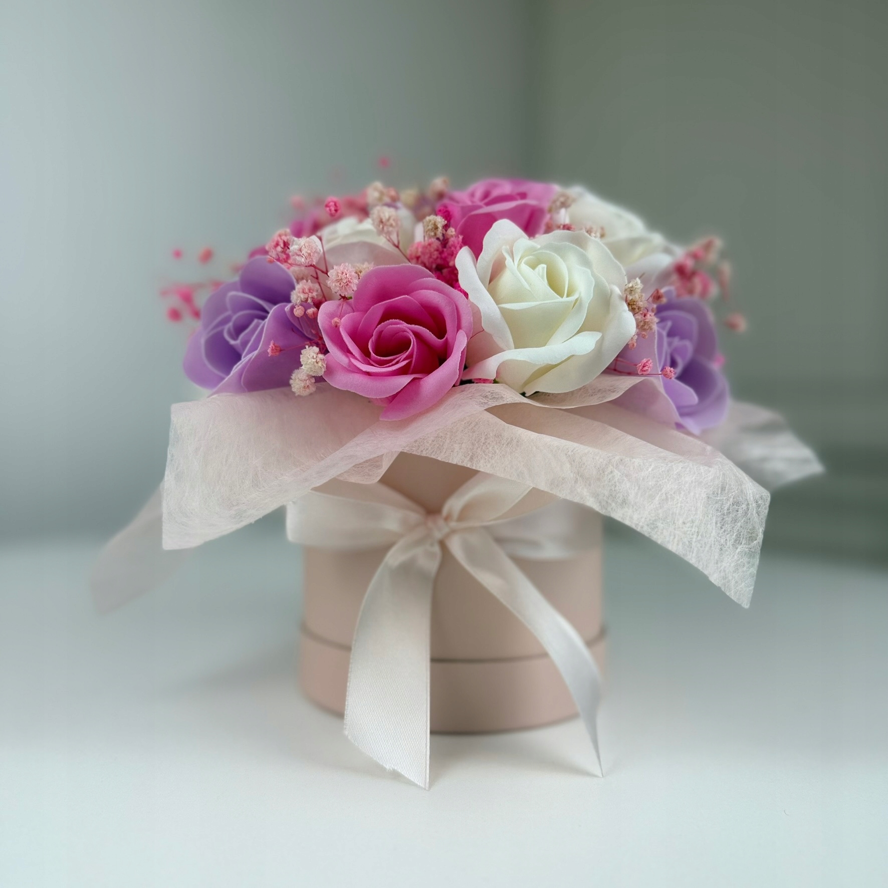 ☑ Мильні квіти у відтінках рожевого, фіолетового та білого. Додатково біло-рожевий гіпсокартон наповнює композицію