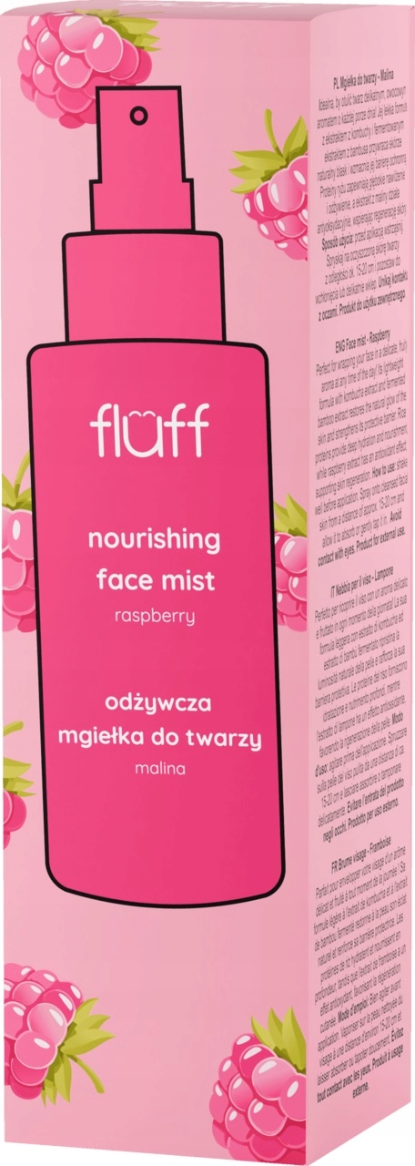 Поживний туман для обличчя Fluff із ароматом малини. Він живить шкіру та огортає її ніжним фруктовим ароматом.