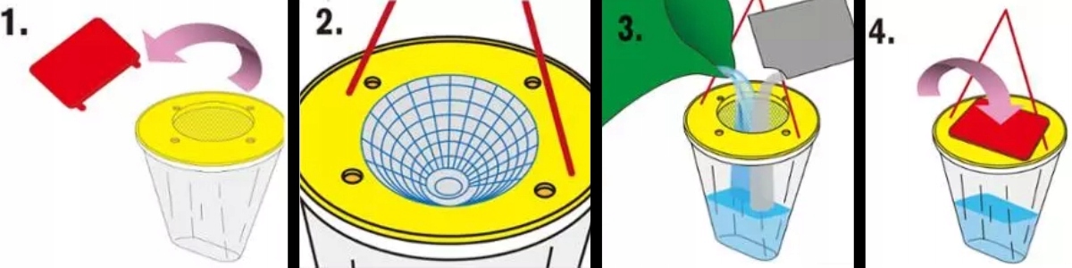 - Пастка починає працювати через 2 дні. Щотижня наповнюйте невеликою кількістю води.