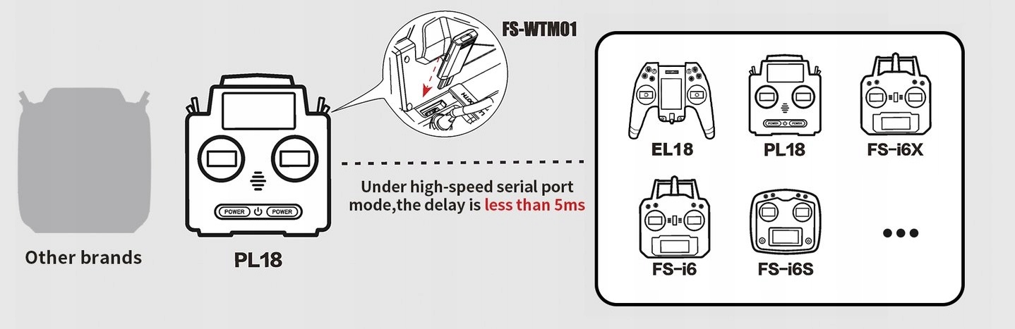 PL18 має функцію бездротового тренера та усуває проблему короткої лінії тренера під час перемикання між керуванням тренера та керуванням учасником. Він дуже сумісний і може бути підключений до Flysky AFH DS 2A та AFHDS 3G та передавачів інших марок.