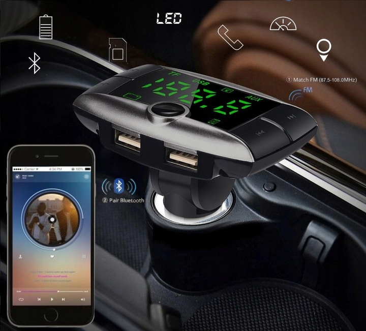 Трансмітер є багатофункціональним продуктом, це Bluetooth-плеєр, розроблений для легкових автомобілів, оснащений професійною високою продуктивність Модуль Bluetooth і система декодування MP3 WMA FLAC APE, заряджає електронні пристрої, також може замінити гарнітуру.