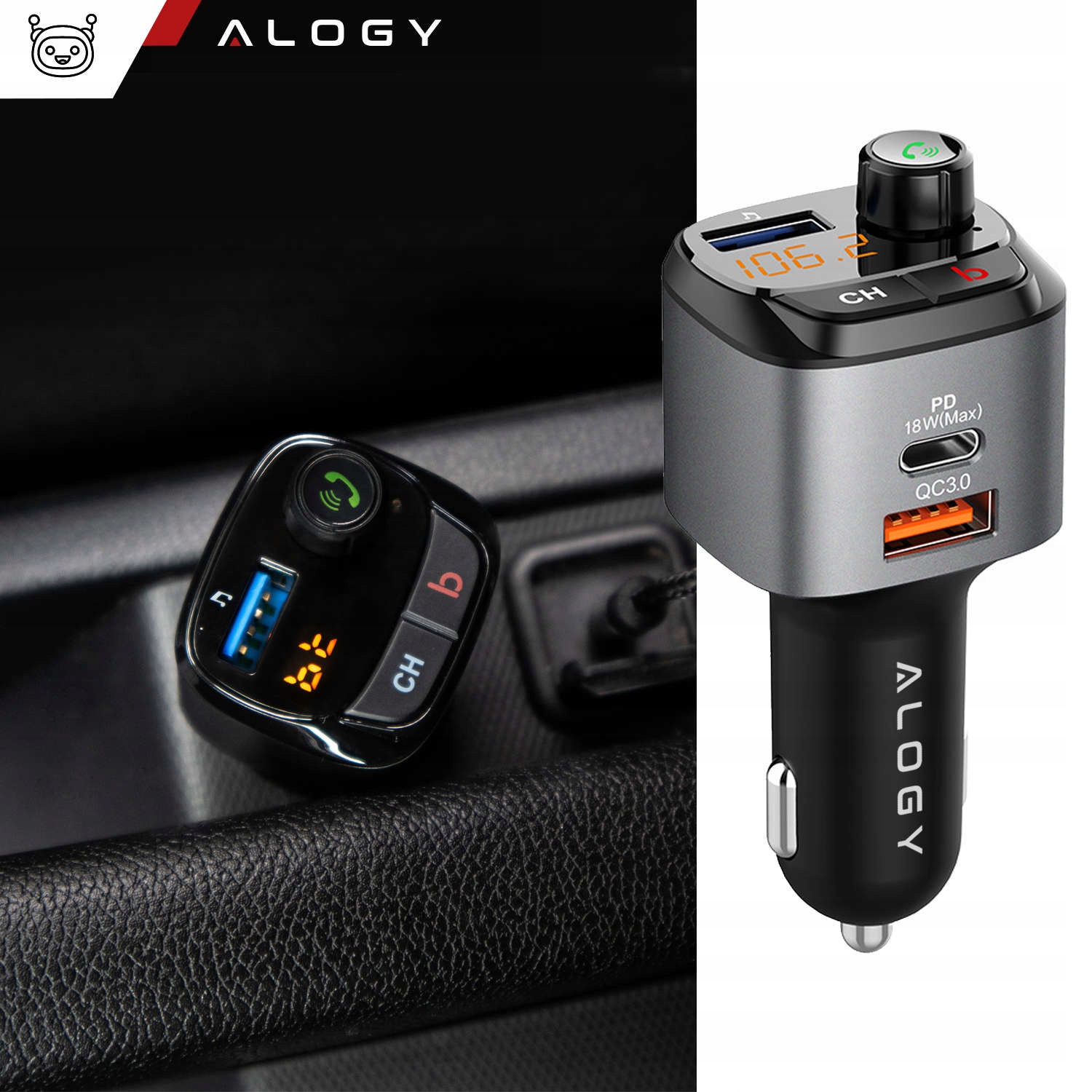 Автомобільний FM-передавач Alogy Зарядний пристрій USB QC 3.0 + USB-C PD Bluetooth для MP3-плеєра – це високоякісний зарядний пристрій, оснащений модулем Bluetooth V5.0 і FM-трансмітером для відтворення власної музики через автомобільне радіо.
