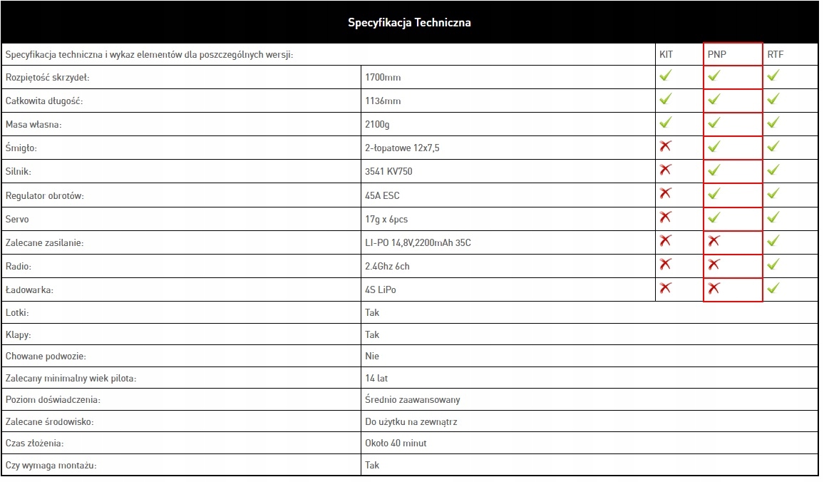 Літак у версії PNP, в комплект входить модель, шасі (колеса), двигун, контролер і сервоприводи. Ви повинні придбати акумулятор, зарядний пристрій, передавач і приймач самостійно.