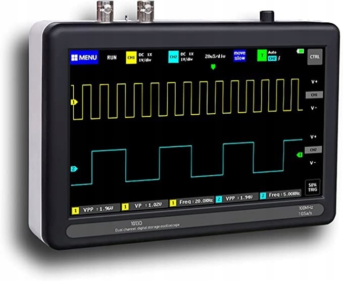 Портативний цифровий осцилограф з двома каналами вимірювання. Пропонуючи смугу частот 100 МГц і частоту дискретизації 1 Гв/с, осцилограф дозволяє виявляти зміни сигналу в реальному часі. Пристрій дозволяє вимірювати основні параметри, включаючи частоту, період і шпаруватість сигналу. Також варто звернути увагу на режим тригера, який може працювати в автоматичному, звичайному або одиночному режимі вимірювання. Максимальна напруга, яку можна подати на вимірювальний роз’єм, становить 40 В для дільника x1 і 400 В для дільника x10. Функція Autoset дозволяє легко регулювати часову базу та автоматичне посилення відповідно до потреб сигналу, що перевіряється. Осцилограф живиться від акумулятора ємністю 6000 мАг, що забезпечує 4 години безперервної роботи. Заряджається через USB роз'єм. Сигнали відображаються на вбудованому великому 7-дюймовому РК-дисплеї, що забезпечує хорошу видимість сигналів. Він добре працюватиме за будь-яких умов, особливо як портативний інструмент для роботи поза майстернею.