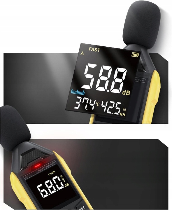 - Великий, зручний для читання екран,який відображає цифрове значення та динамічну шкалу шуму