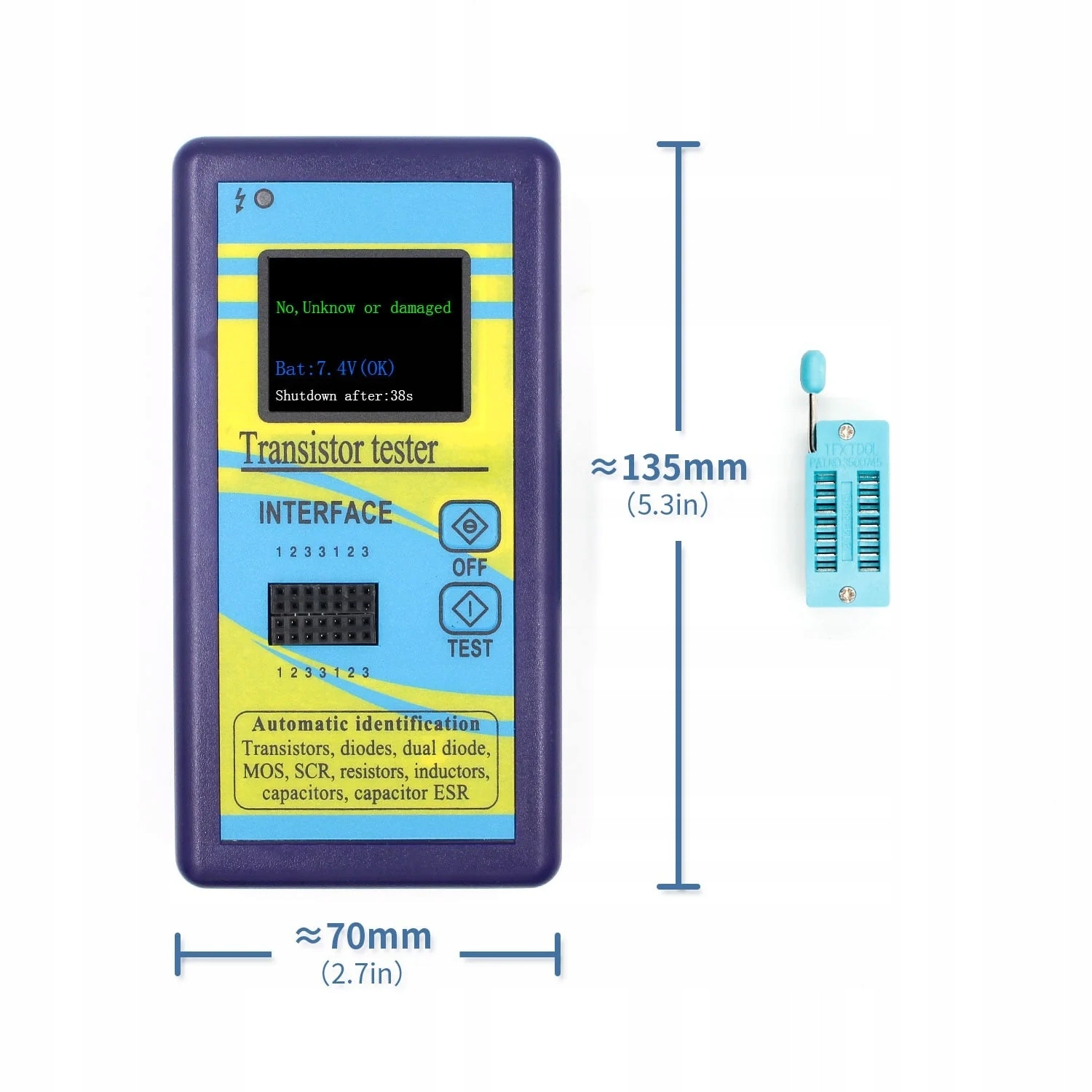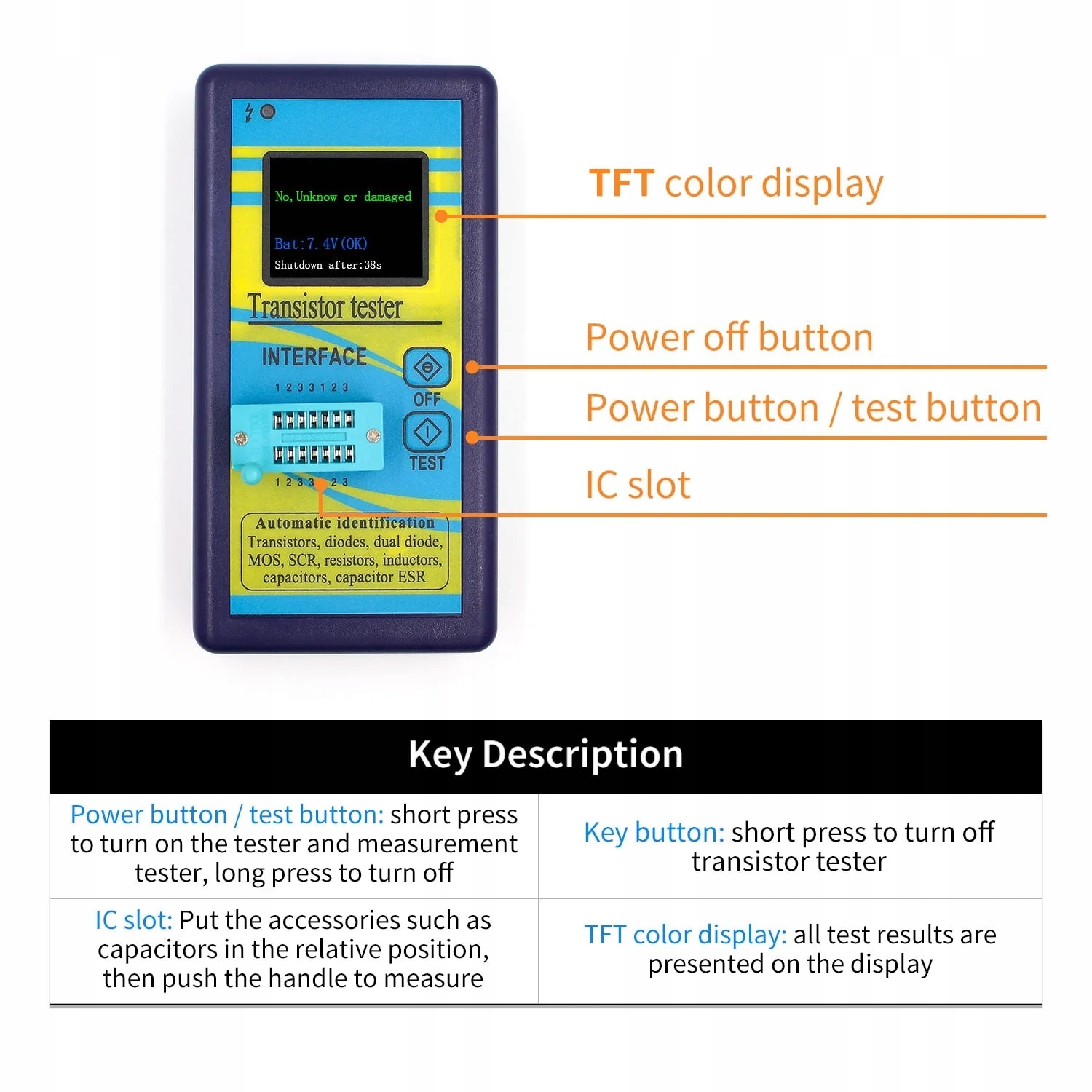Тестер автоматично виявляє транзистори NPN і PNP, МОП-транзистори типу N і P, діоди, тиристори, резистори, конденсатори та інші пристрої. Крім того, він також може перевіряти контакти певного компонента та відображати інформацію про нього на РК-дисплеї.