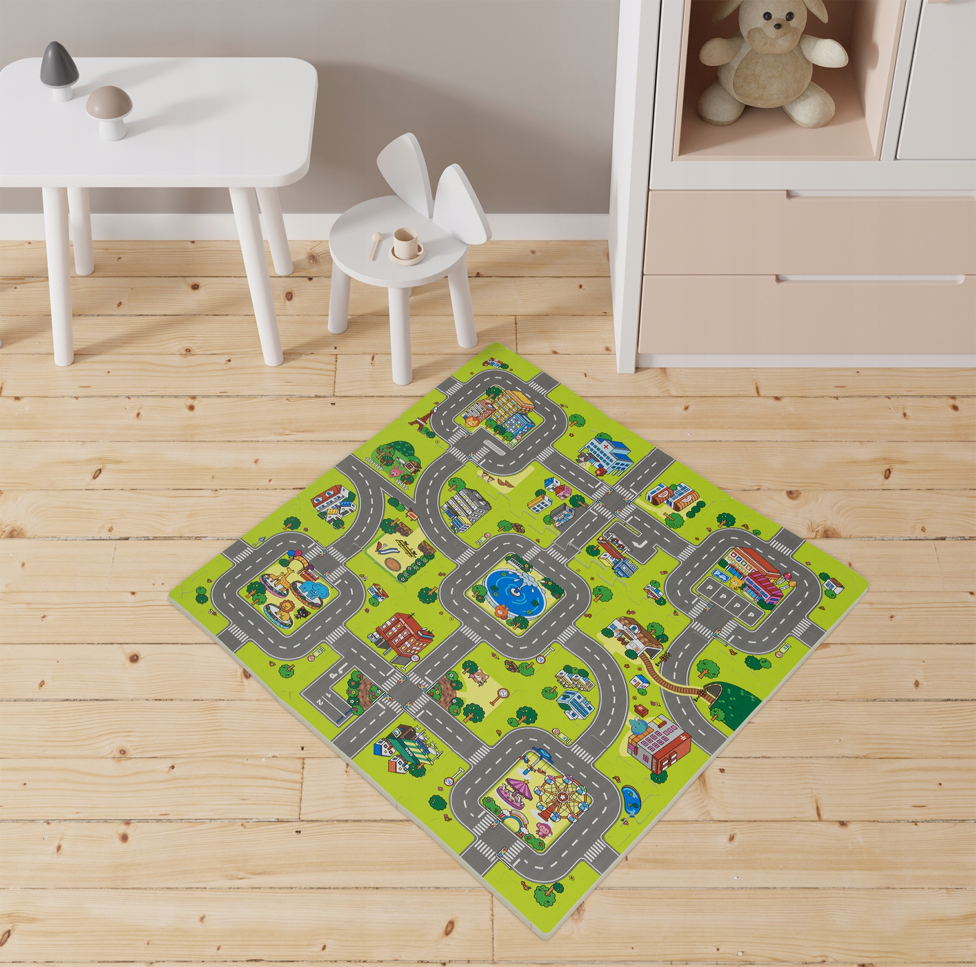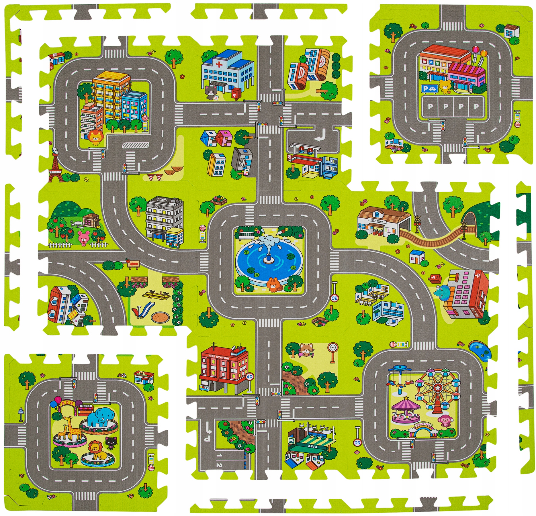 Цей унікальний, мі< b >ękka поролоновий килимок забезпечить вашій дитинікомфорт і безпекуń під час гри і навчитися повзати. Поролоновий килимок призначений для дітей з перших днів життя. Купуючи більше одного набору, пазли можна комбінувати, створюючи ще більше простору для безпечної гри для вашої дитини (пазли сумісні в одній моделі). Кожен із 9 пазлів містить іншу частину міста та численні вулиці, тож зібраний килимок може служити чудовим майданчиком для іграшкових машинок та урізноманітнити розваги наймолодшого.