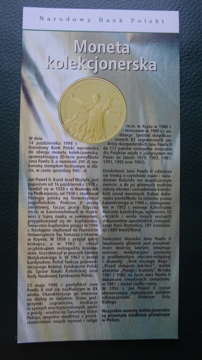 Folder 200 zł 1998,20 LAT PONTYFIKATU JP II,stan I