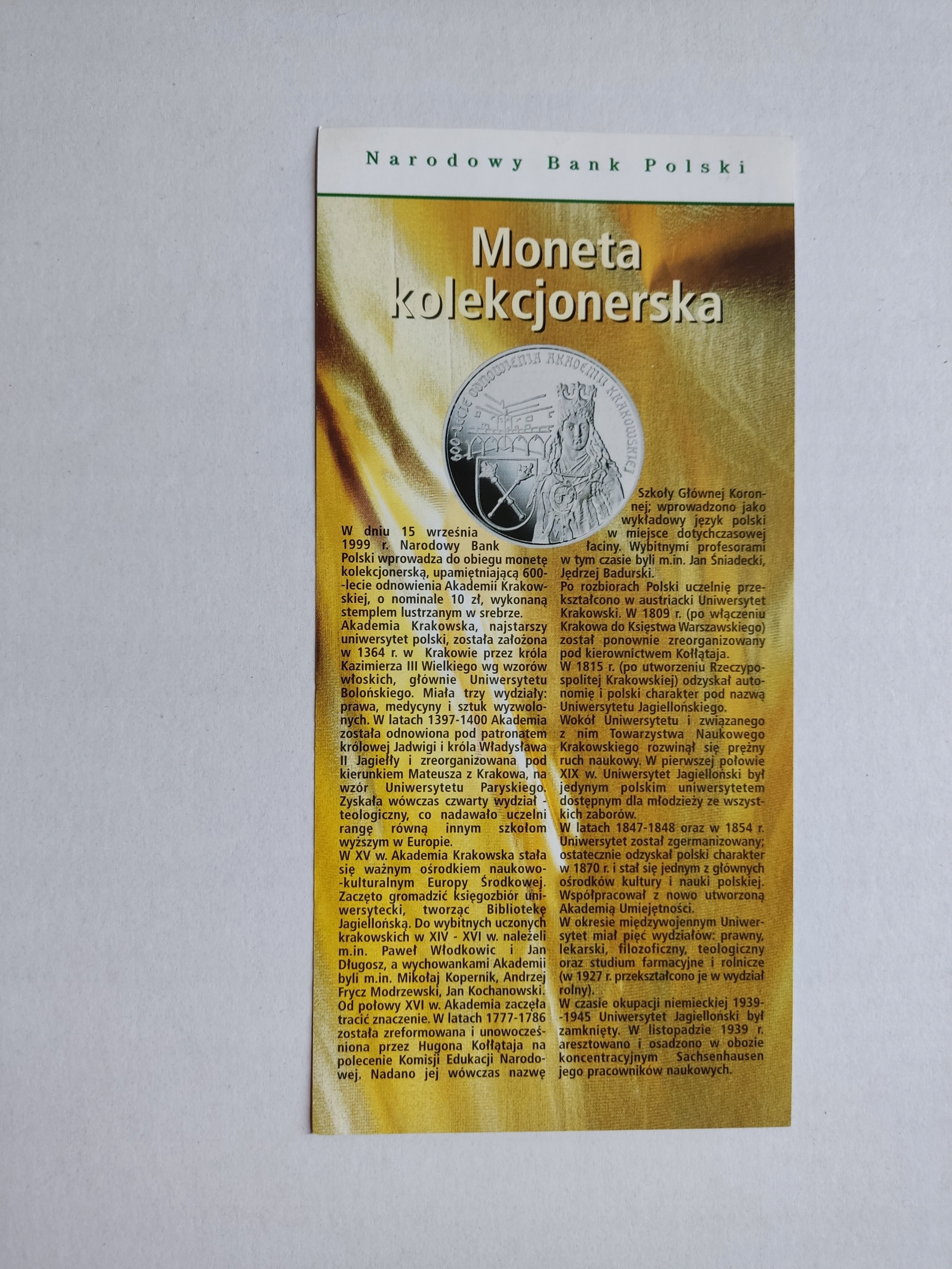 Folder NBP 1999 600-lecie odnowienia Akademii Krakowskiej j.polski