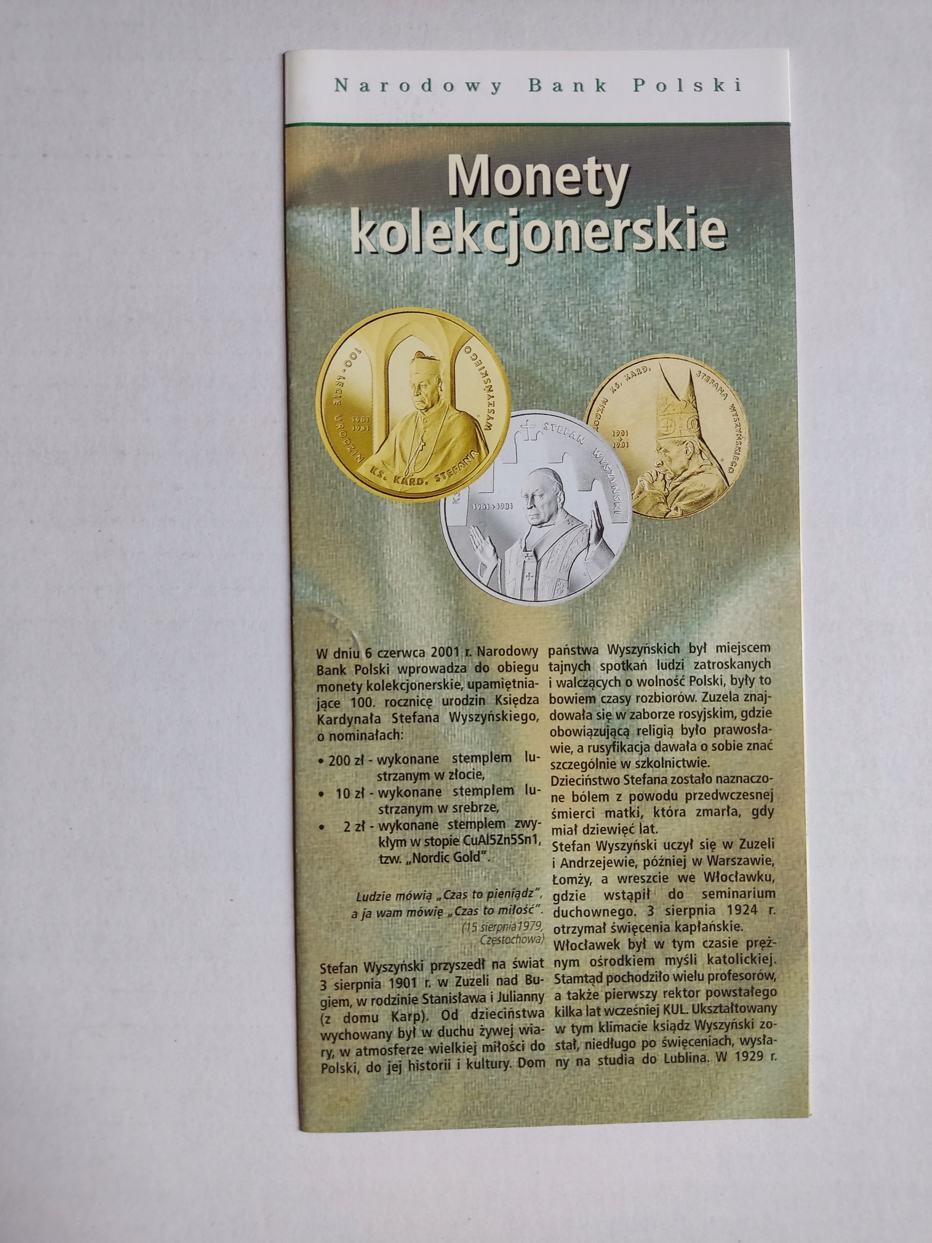 Folder NBP 2001 rok 100-rocznica urodzin Stefana Wyszyńskiego w j. polskim