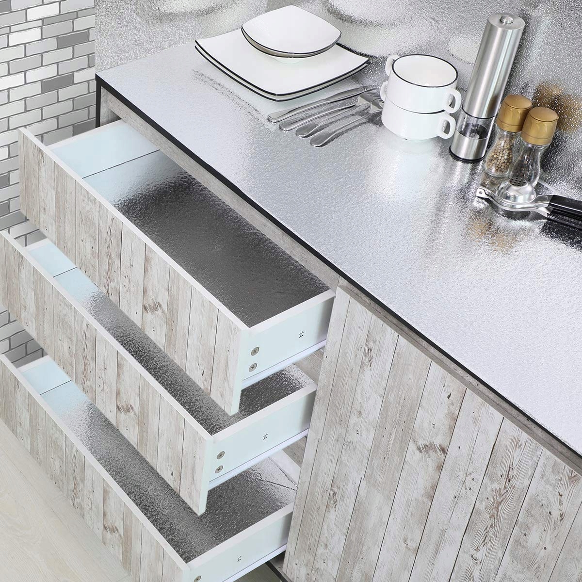 - Ця алюмінієва фольга ідеально підходить для декорування кухонь, ванних кімнат, комор, посудомийних машин, панелей посудомийних машин, духових витяжок, холодильників , обладнання для громадського харчування та інше.
