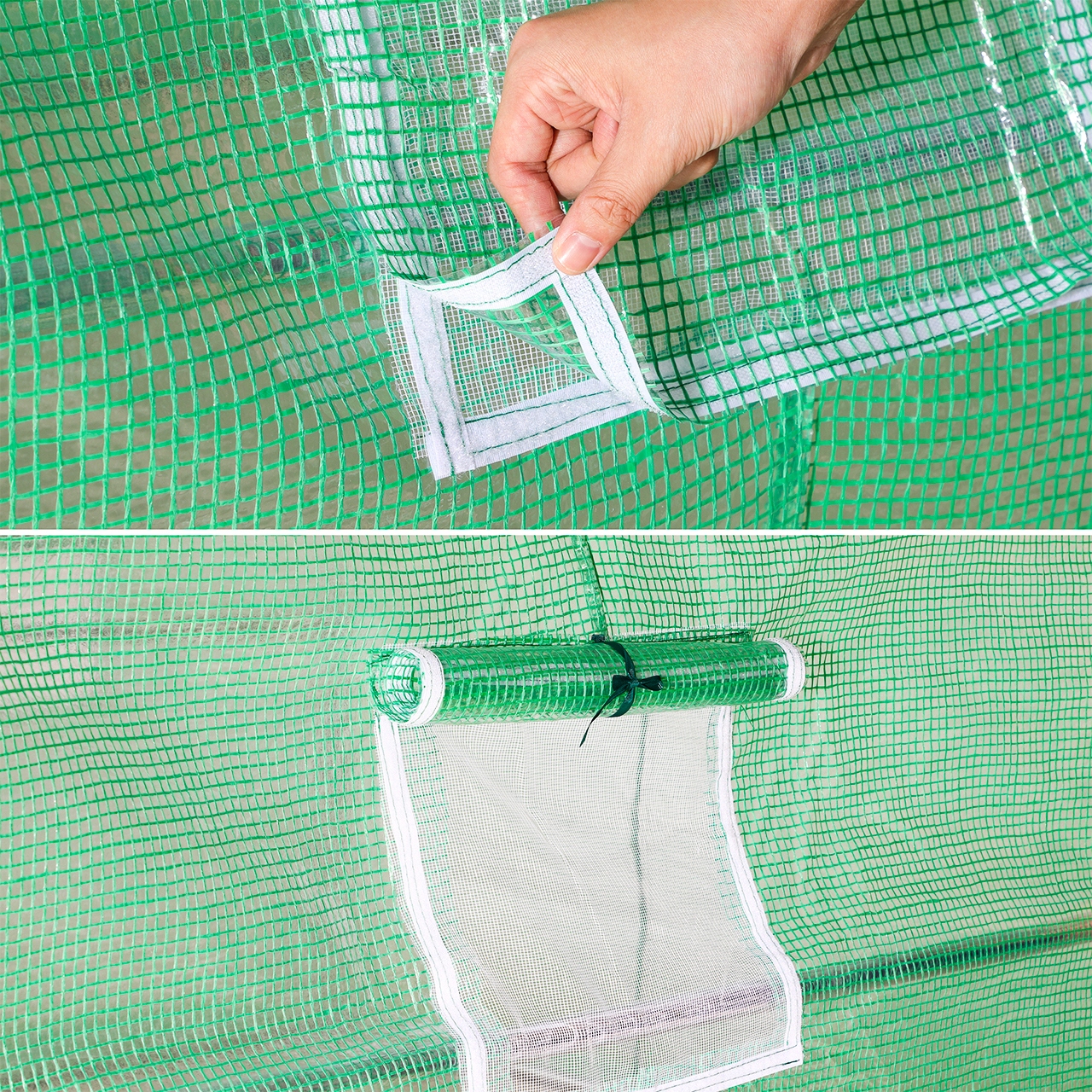 Це дозволяє вільно входити в теплицю та виходити з неї. Розчин також можна використовувати для вентиляції приміщень. Дверцята застібаються на блискавку.
