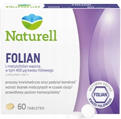 Naturell Folian містить L-метилфолат кальцію. Це активна форма фолієвої кислоти, біоеквівалентна фолієвій кислоті, яка природно зустрічається в їжі та не потребує обробки.