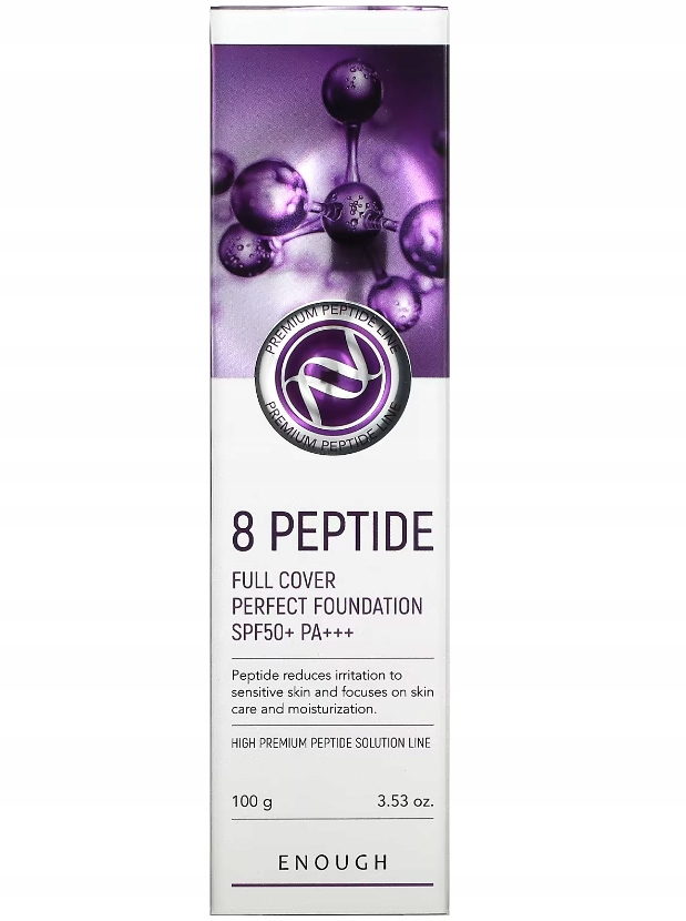 Enough 8 Peptide Full Cover Perfect Foundation SPF 50+ PA+++ – це зволожуюча основа для обличчя з 8 пептидами, які мають здатність проникати в шкіру та стимулювати біологічні процеси.