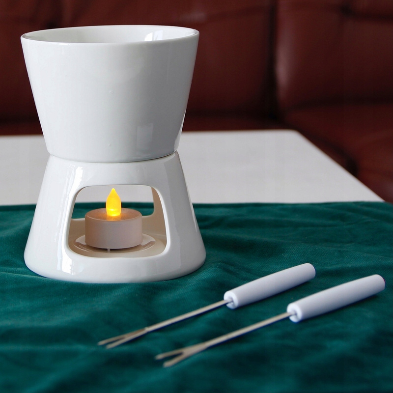 Ця класична та стильна порцелянова чаша ідеально підходить для здійснення солодких мрій. З обігрівачем, шоколадною мискою, 2 вилами для фруктів/закусок і, звичайно, - судном для фондю, ви можете насолоджуватися розтопленим гарячим шоколадом з улюбленими закусками, щоб отримати небесний досвід. Створіть незабутній вечір, насолоджуючись смачним смаком розплавленого гарячого шоколаду, ділячись солодкими моментами з близькими.