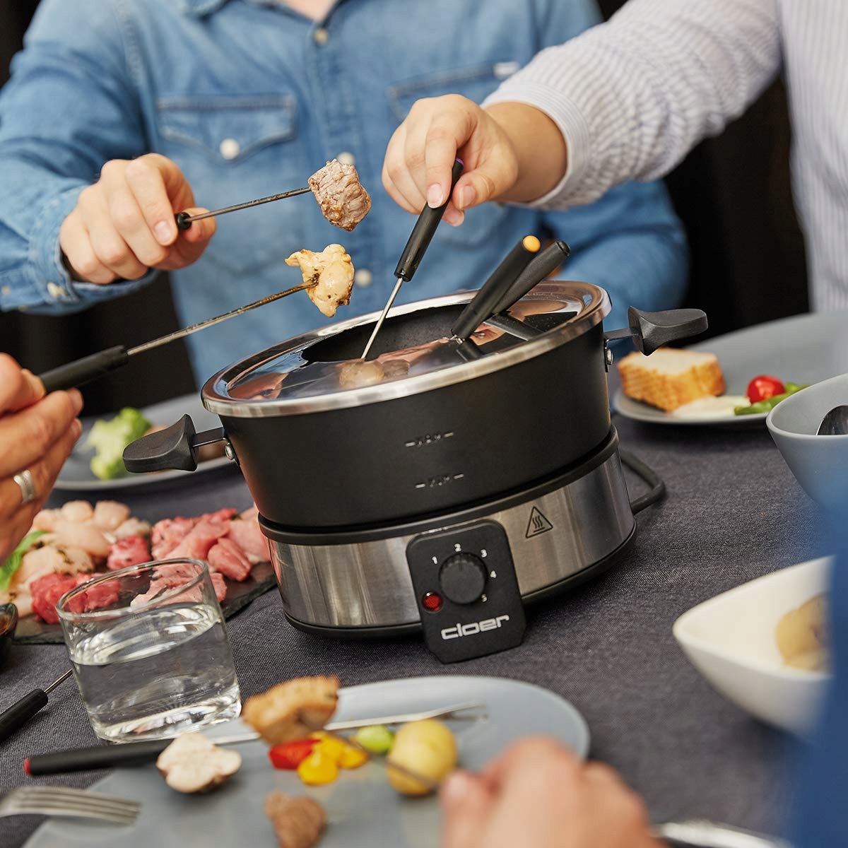 Фондю Cloer 6679 на 8 осіб, алюмінієвий горщик з покриттям, захист від бризок, 8 кольорових виделок 1,5 л, 1000 Вт, сріблястий, чорний