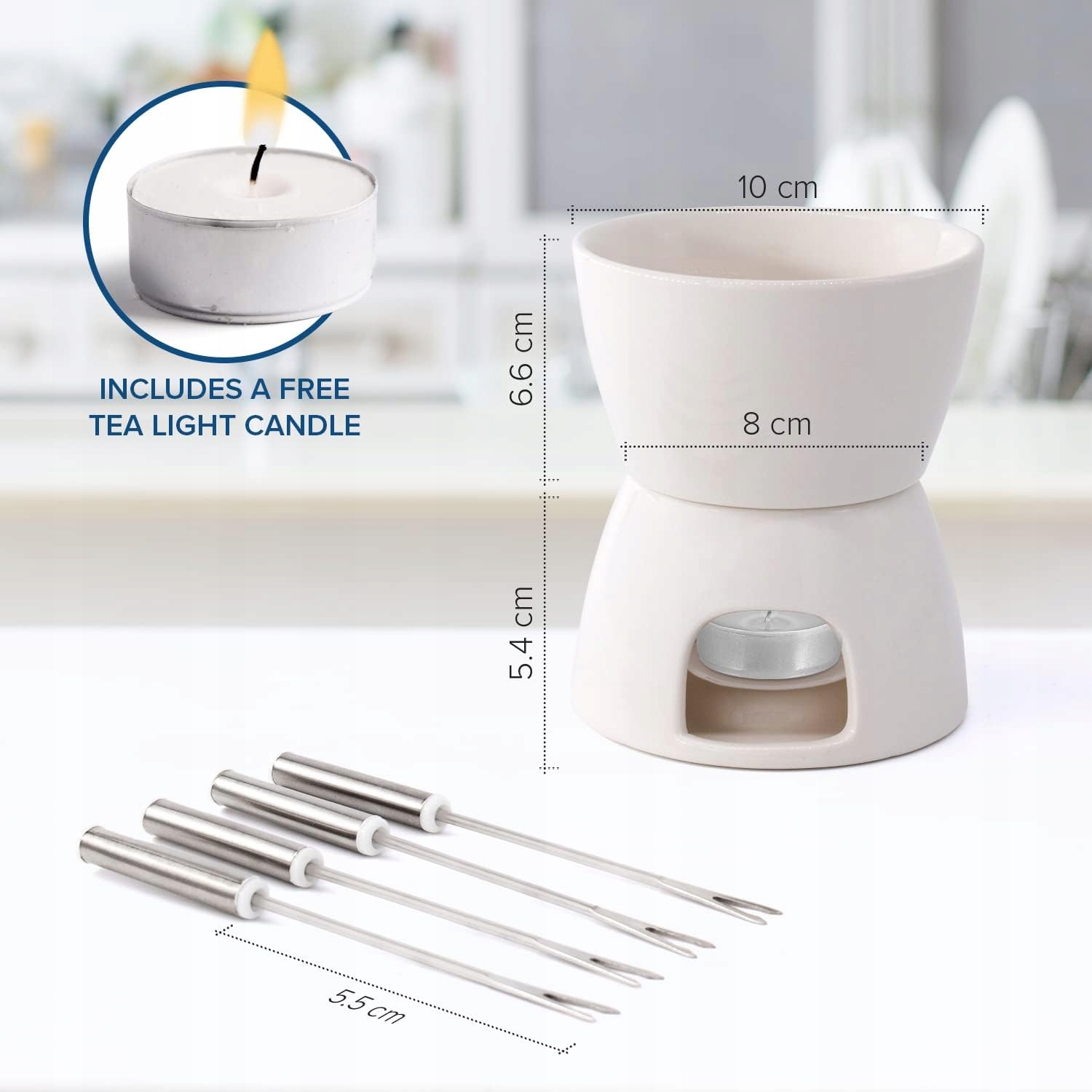 ✅ Наш міні-набір для фондю включає керамічну чашку, основу, чотири виделки з нержавіючої сталі та чайну свічку. Ідеально підходить для приготування простого, але смачного десерту, ідеально підходить для спільного використання чотирма людьми або як подарунок для двох.