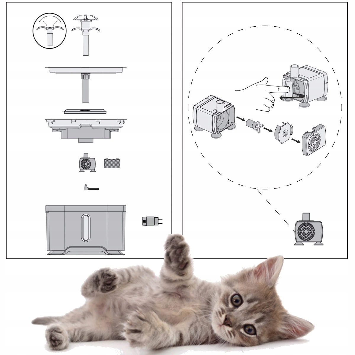 Наша поїлка працює дуже тихо, тому не заважає комфорту домочадців і її можна залишати увімкненою також на ніч. Це пристрій з низьким енергоспоживанням, тому вам не доведеться турбуватися про рахунки. Кіт може легко знайти поїлку в темряві завдяки світлодіоду всередині неї.