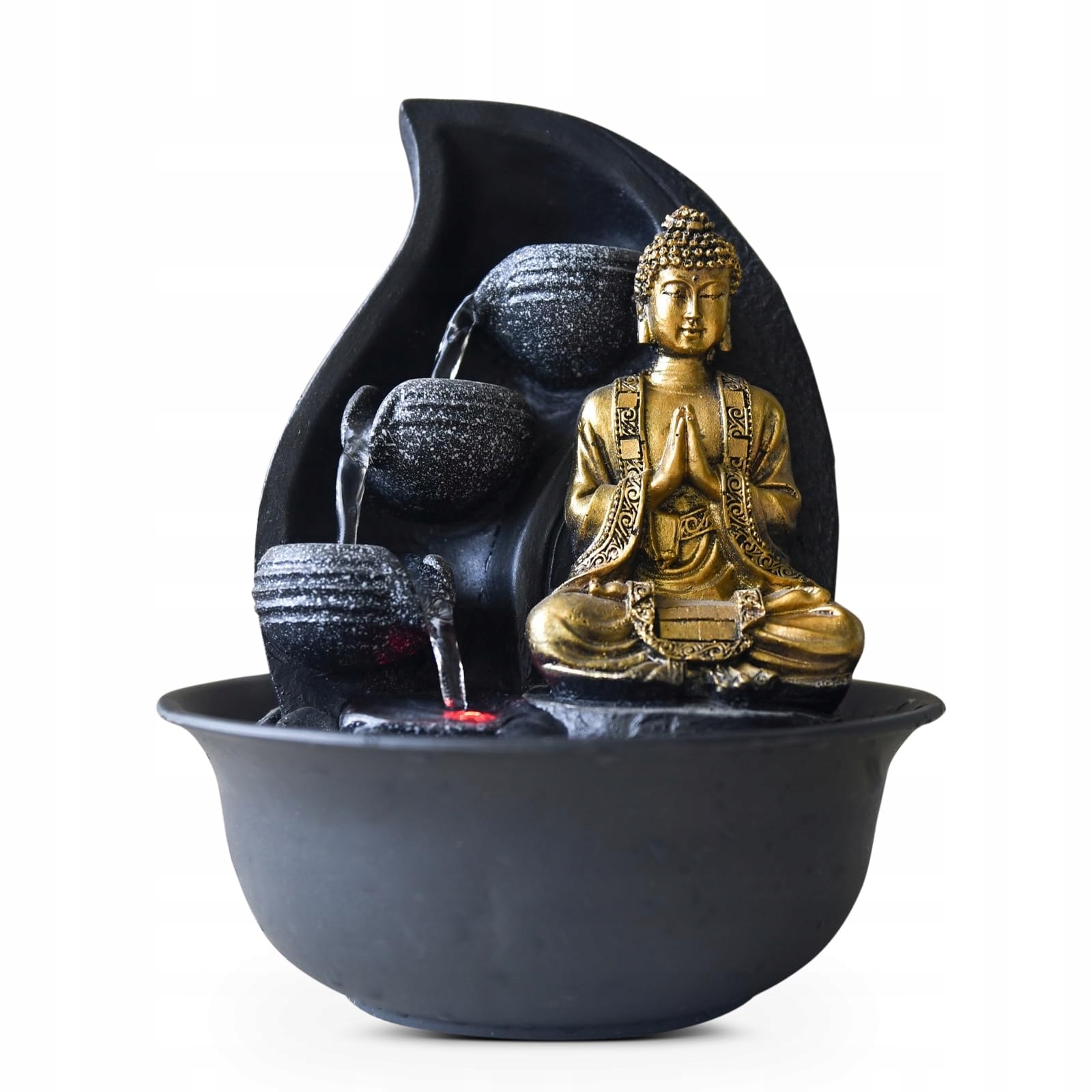 світлодіодне освітлення та знімний статуетка: барвисте світлодіодне освітлення, яке підкреслює декор та потік води. Статуетка Будди можна видалити та замінити прикрасами (ще одна статуетка, статуетка, маленька свічка, щаслива тощо)