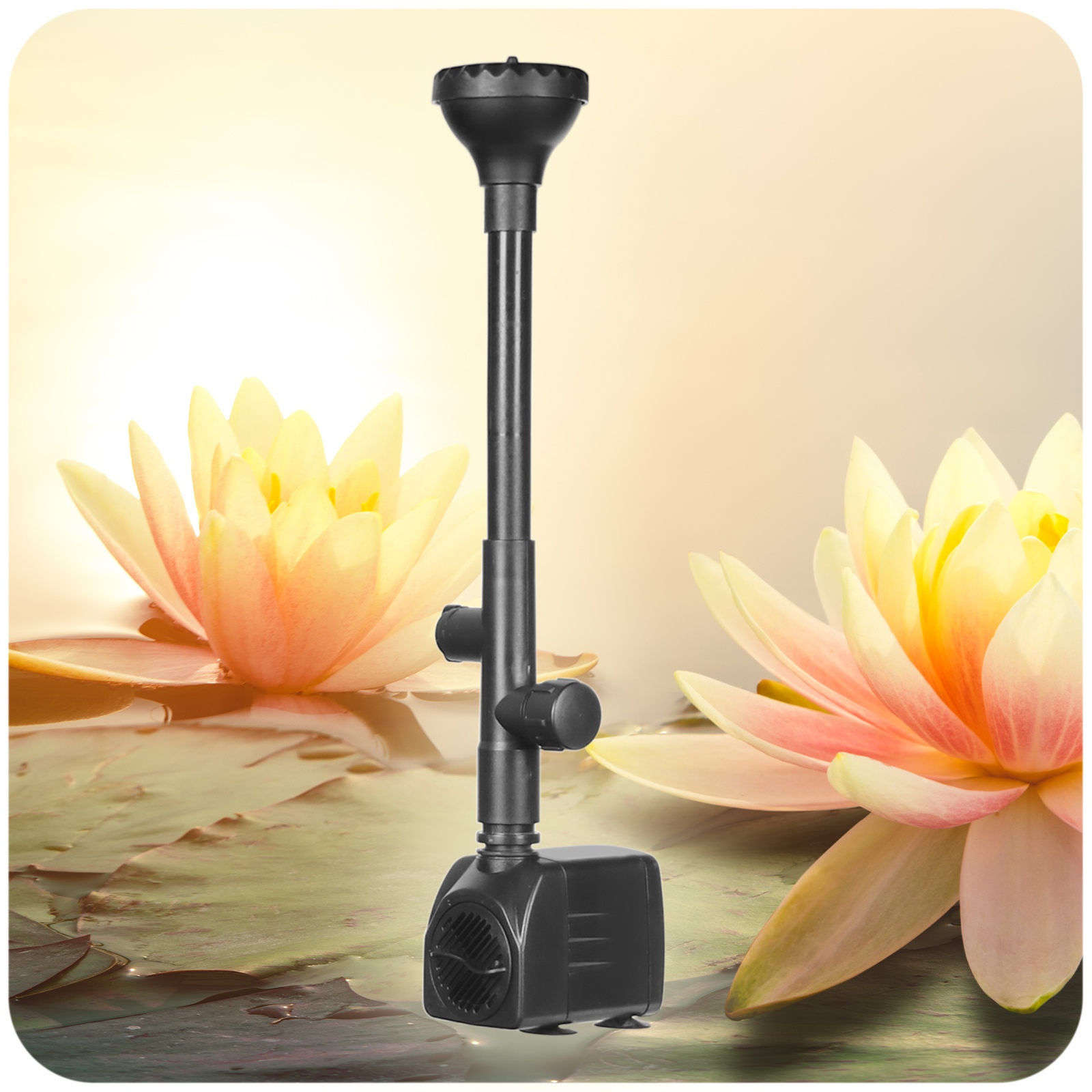 Фонтан, встановлений для водойм. Набір включає водяний насос з мініатюрними розмірами торгової марки Kruger Meier та Outlet - фонтан . Насос має плавну регуляцію продуктивності і повністю занурюється.
