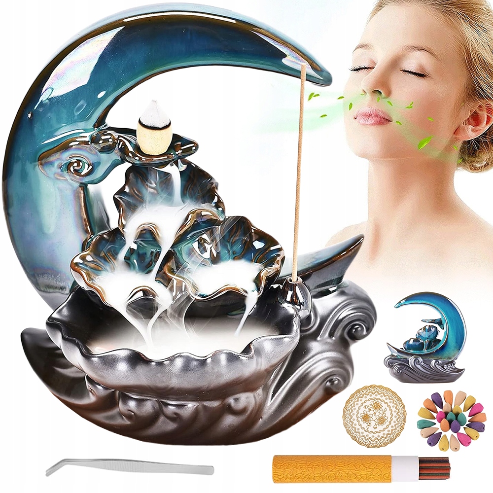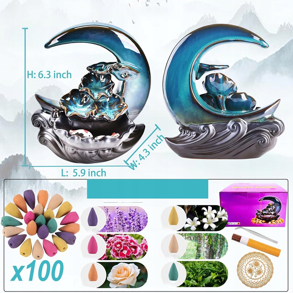 Відкрийте для себе магію нашої керамічної курильниці ручної роботи у формі блакитного місяця, яка перетворить ваш інтер’єр на оазис спокою! Унікальний дизайн із мотивами лотоса, риби та хвилі створює зачаровуючий ефект струмуючого диму, схожого на водоспад.