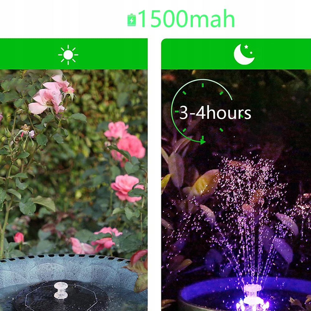 - 💦【Кольоровий сонячний фонтан із 8 світлодіодами】: Сонячний фонтан потужністю 3 Вт оснащено 8 світлодіодами. Різнокольорове освітлення вмикається автоматично вночі. Насос сонячного фонтану повністю заряджений і може працювати приблизно 3-4 години вночі.