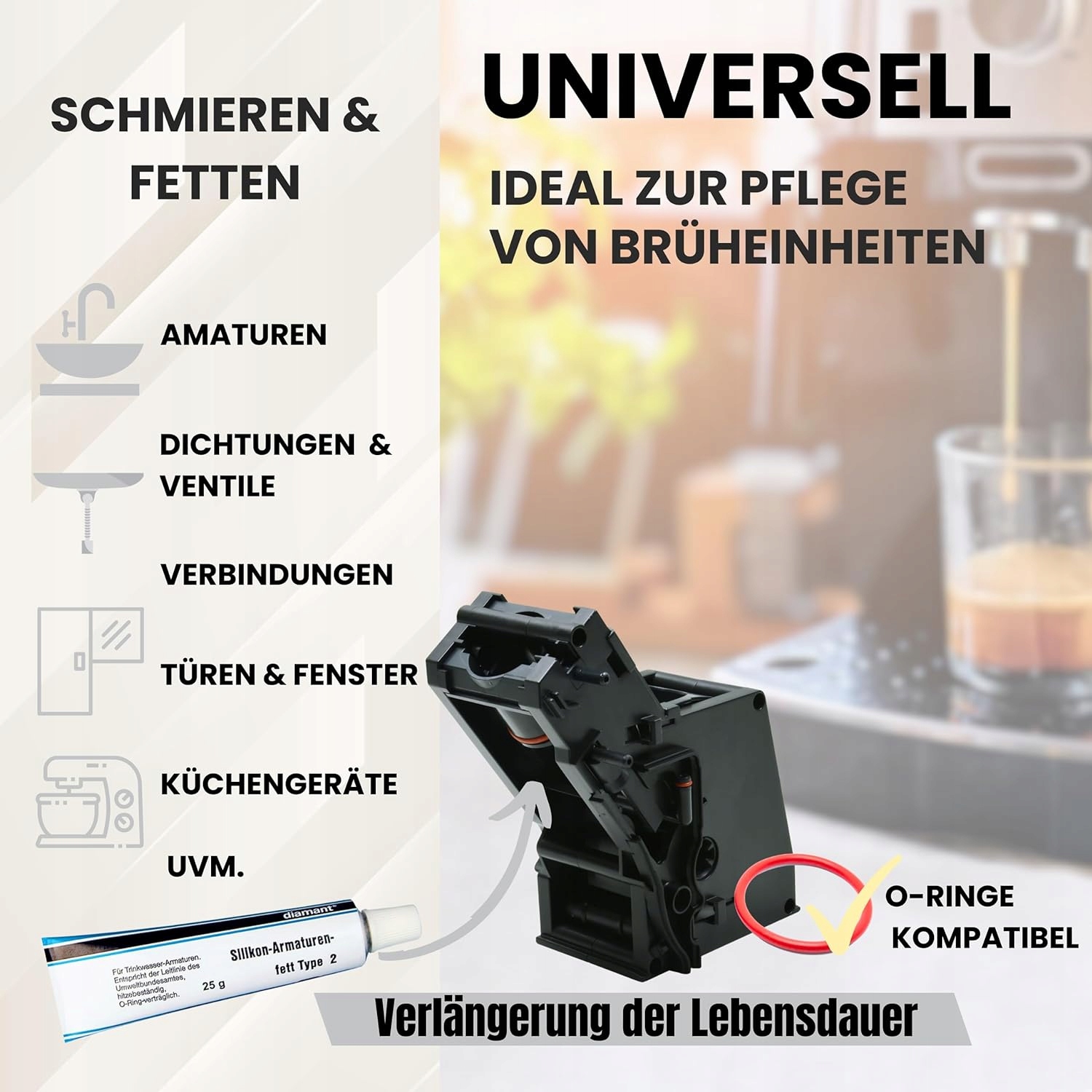 Силіконова мастило підходить не тільки для кавових машин, але також для ущільнювачів і стекол автомобіля, як мастило для пластикових і сантехнічних елементів. Ідеально підходить для змащування ущільнювальних кілець і ущільнювачів.