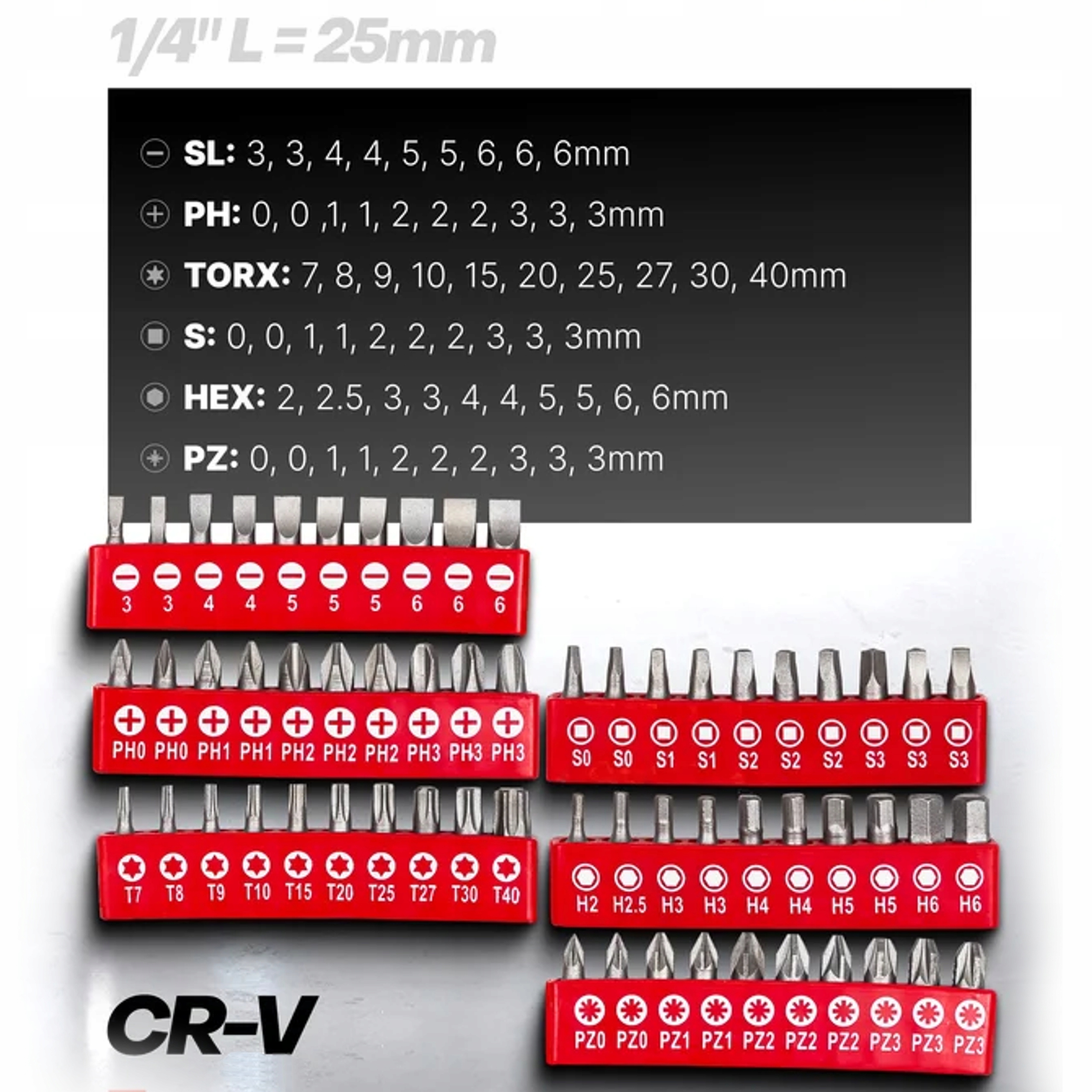 Набір містить плоскі викрутки, викрутки Phillips, Torx, квадратні викрутки та широкий вибір біт і головок. Завдяки цьому набір охоплює практично всі найпоширеніші види шурупів і шурупів.