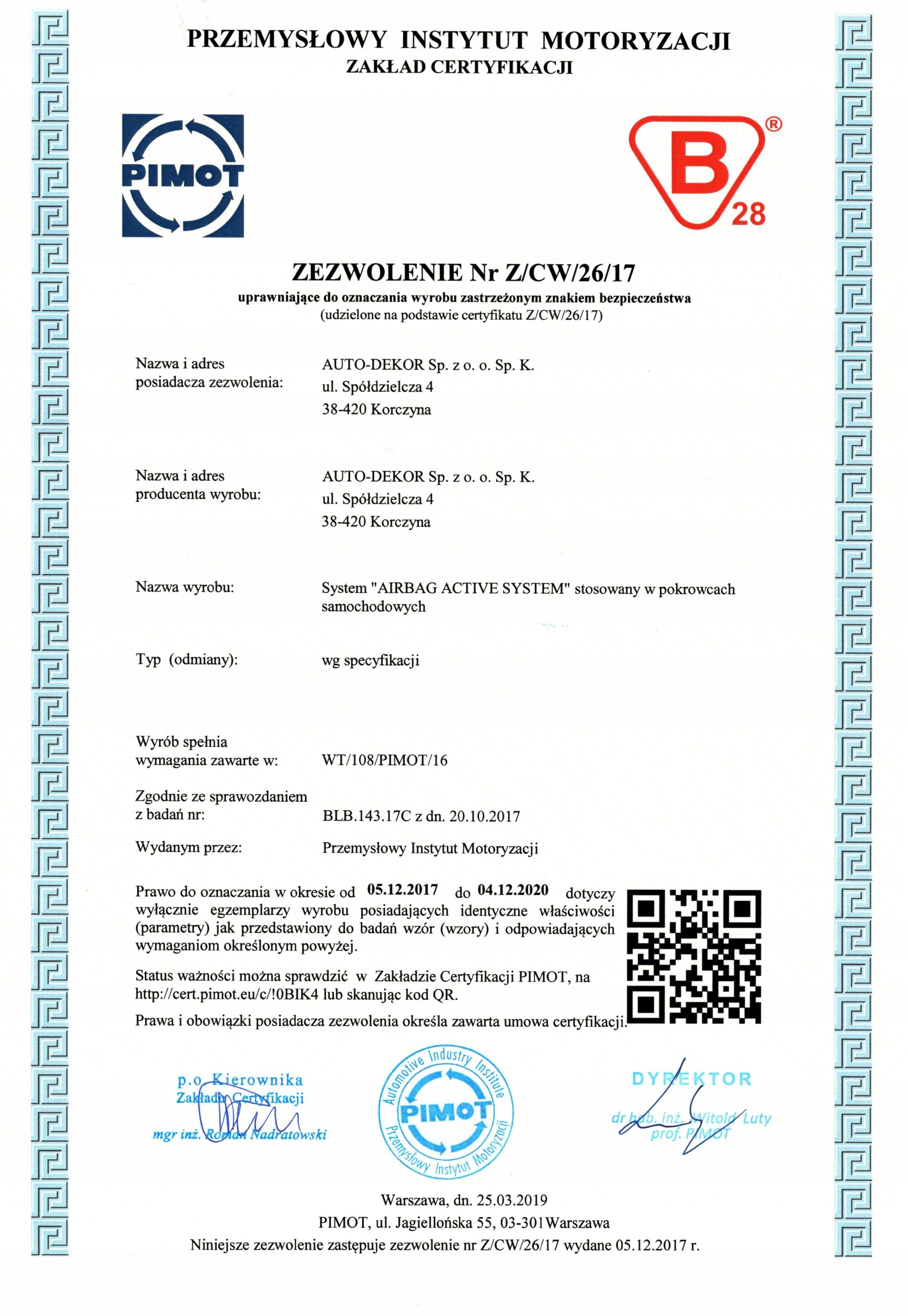Звичайно, це рішення неодноразово перевіряється та сертифікується. Дослідження, підтверджені сертифікатом безпеки, проводили промисловим автомобільним центром (PIMOT), що базується у Варшаві, який схвалив безпеку продукту, видаючи сертифікат безпеки "B".