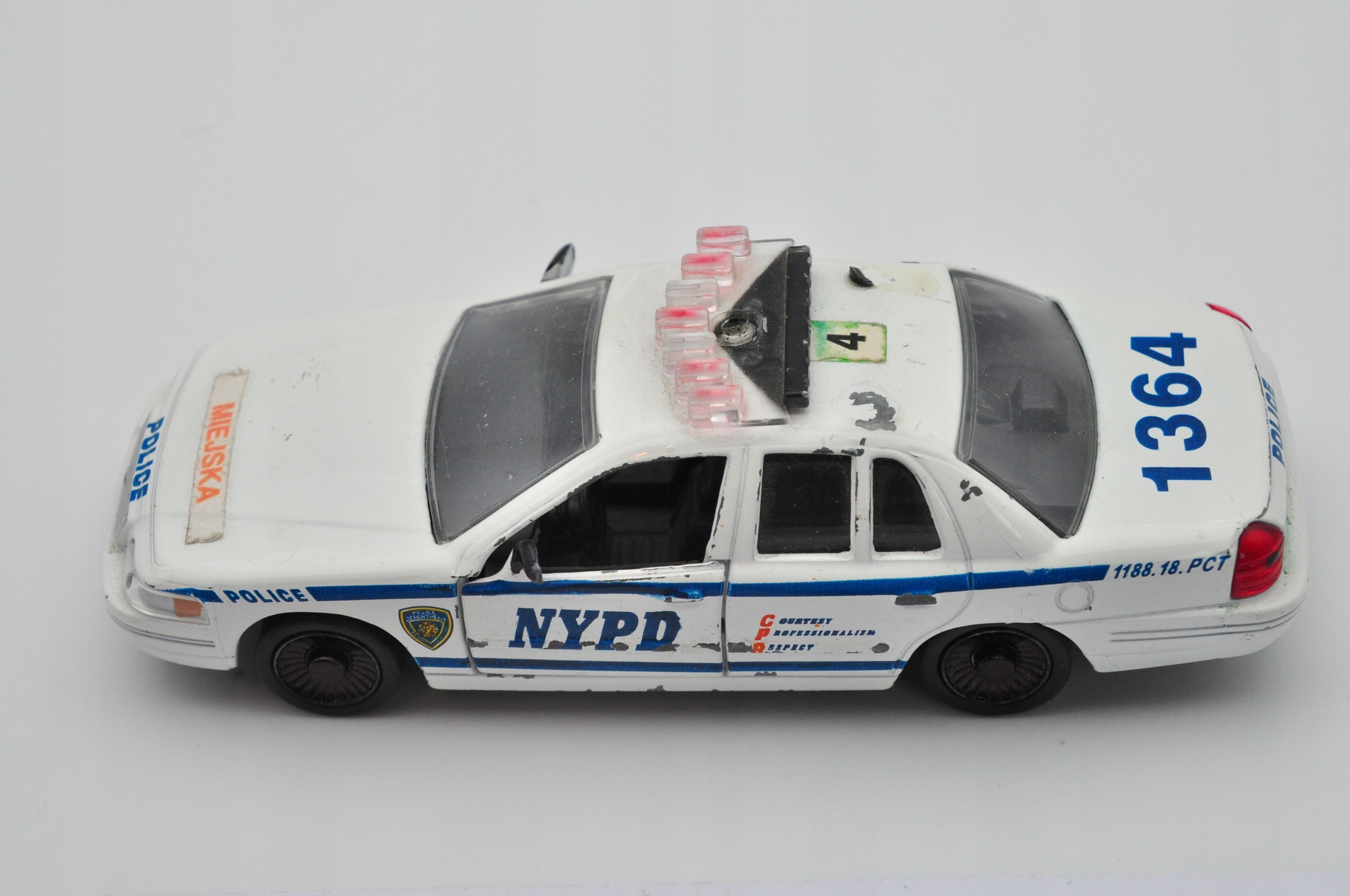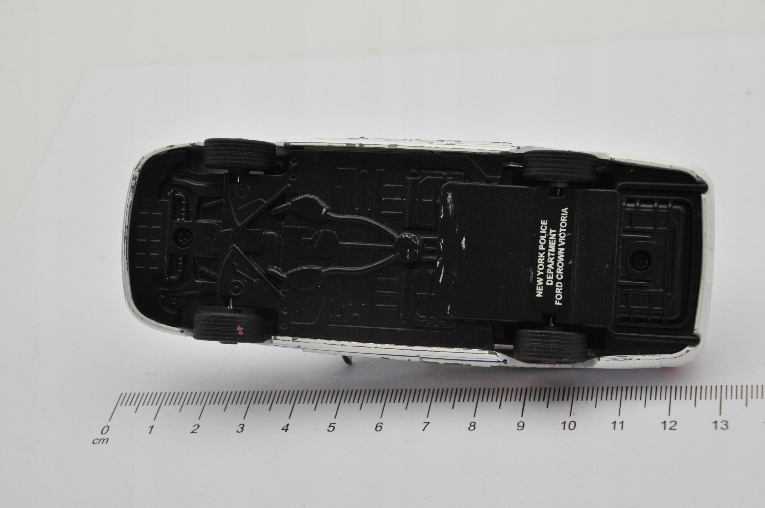 позначка: сірник • Модель: Ford Crown Victoria • Виробник: Mattel • Масштаб: 1:64 • Умова: Використовується • Матеріал: метал+пластик • Довжина (мм): 75 • Кольори: білі з синіми та червоними деталями • Додавання: світлофори на даху, деталі NYPD • Номер каталогу: 1188.18.pct • Зроблено в: Китай