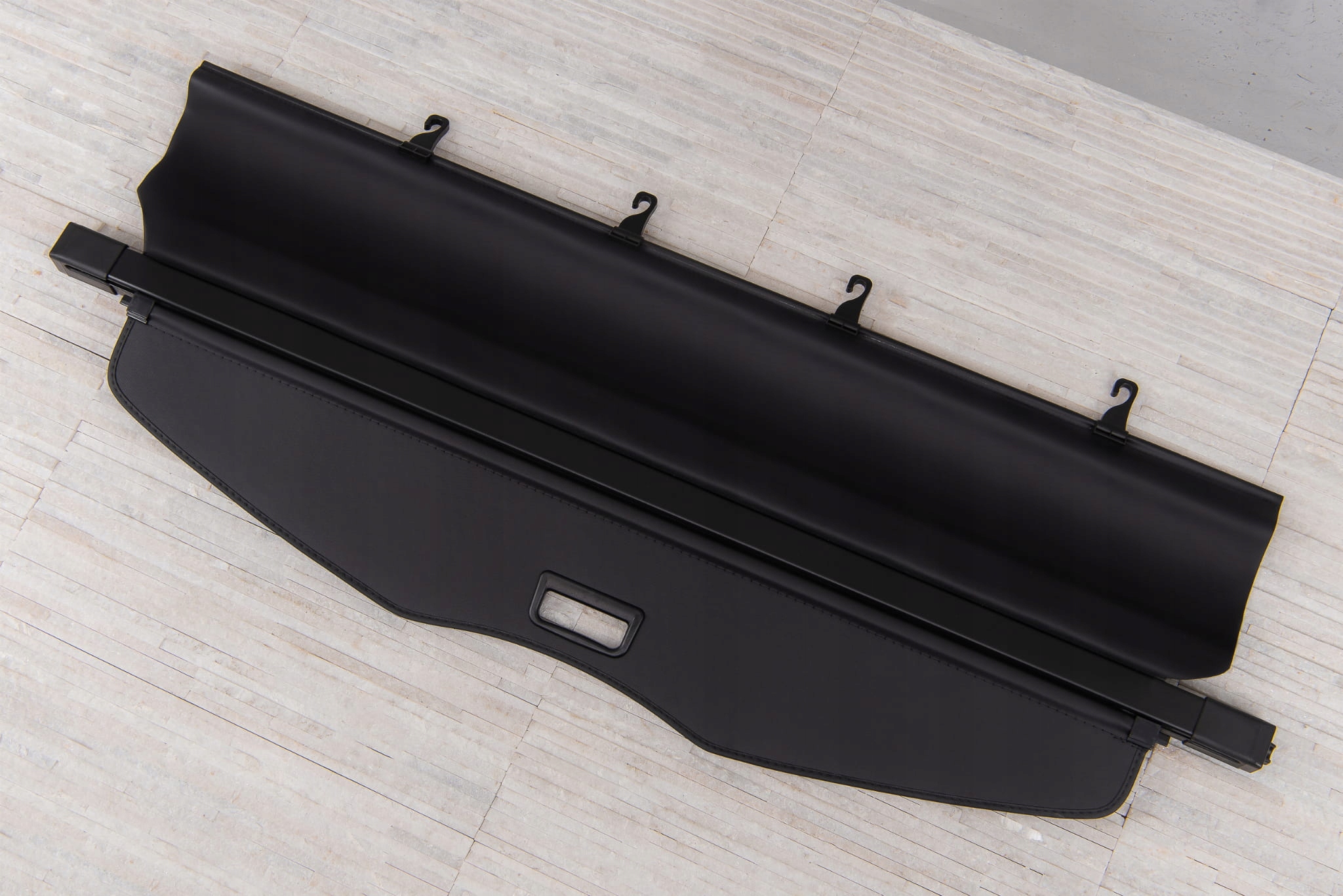Суцільна касета та алюмінієва пластина забезпечують довговічність конструкції та зручність використання жалюзі. Касета була розроблена таким чином, щоб дозволити стабільне кріплення в оригінальних, заводських місцях за задніми сидіннями.